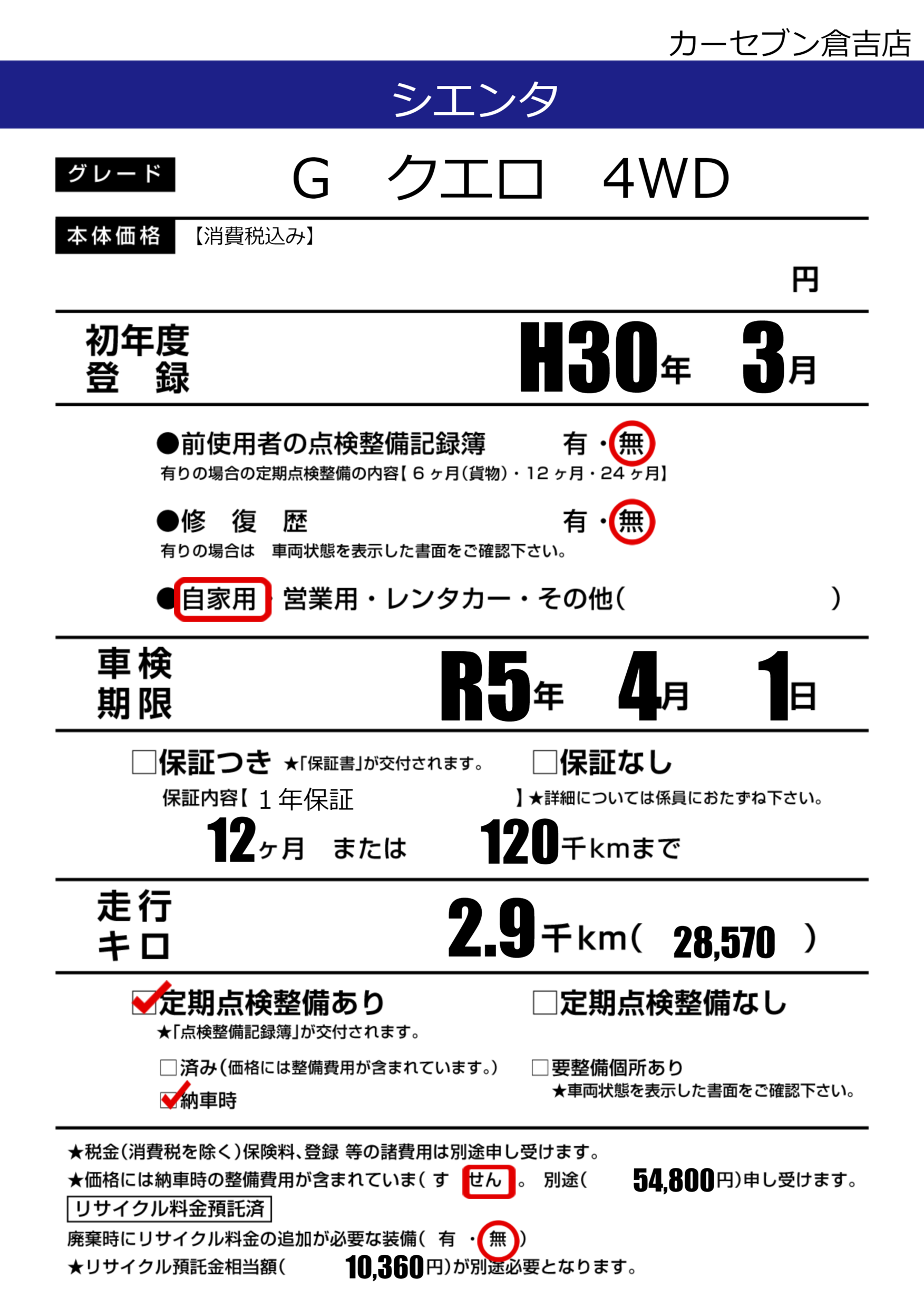 | 車名 | シエンタ | グレード ミッション 排気量 |