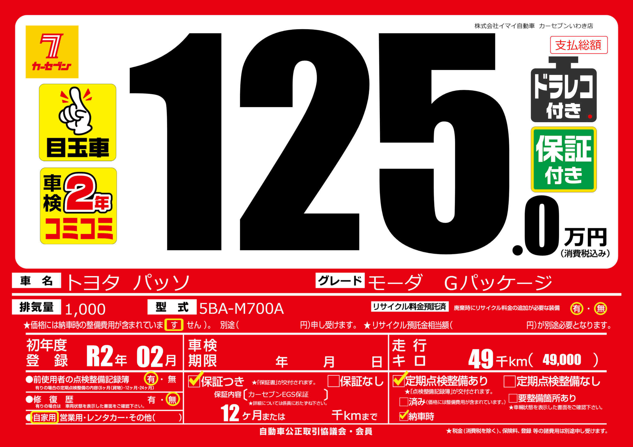 | 車名 | トヨタ パッソ | グレード ミッション 排気量 |