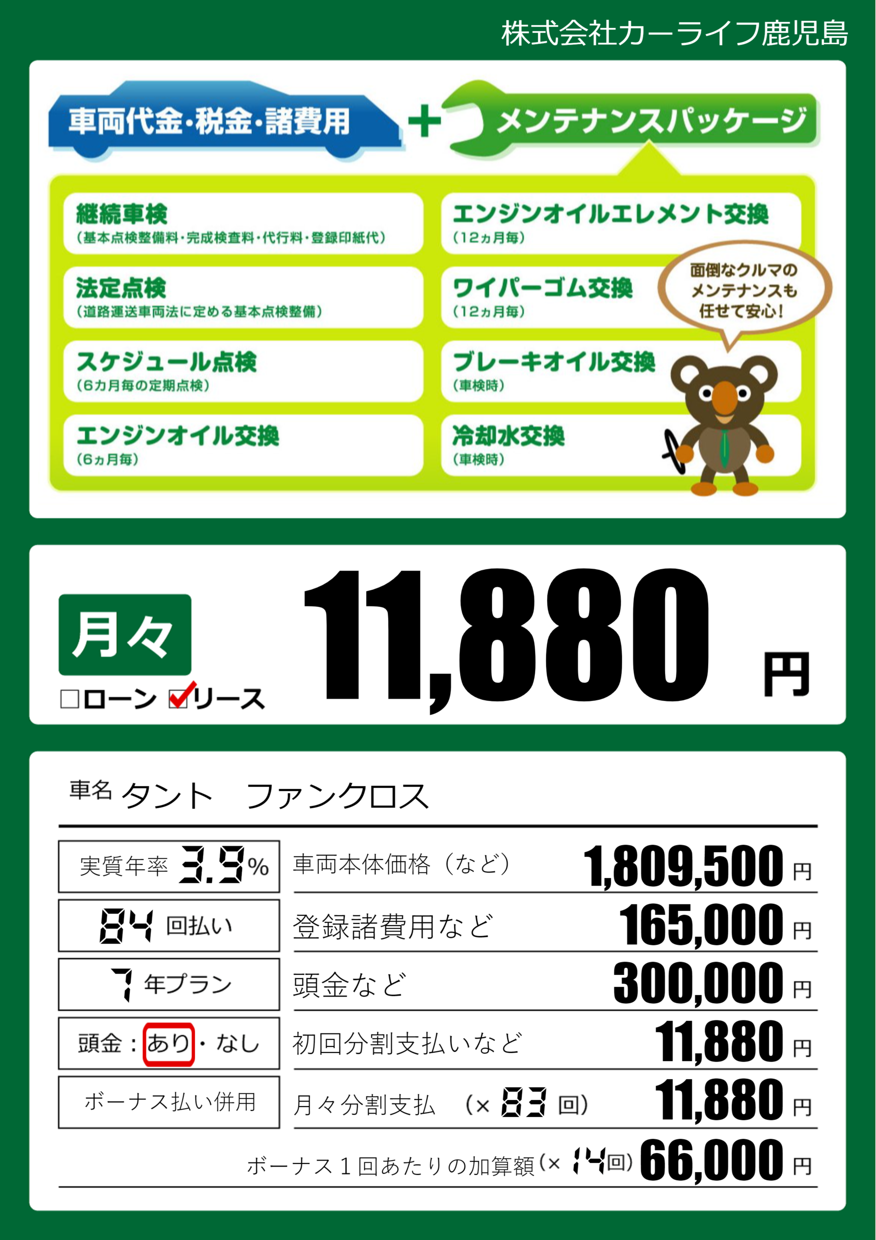 | 車名 | タント ファンクロス | グレード ミッション 排気量 |