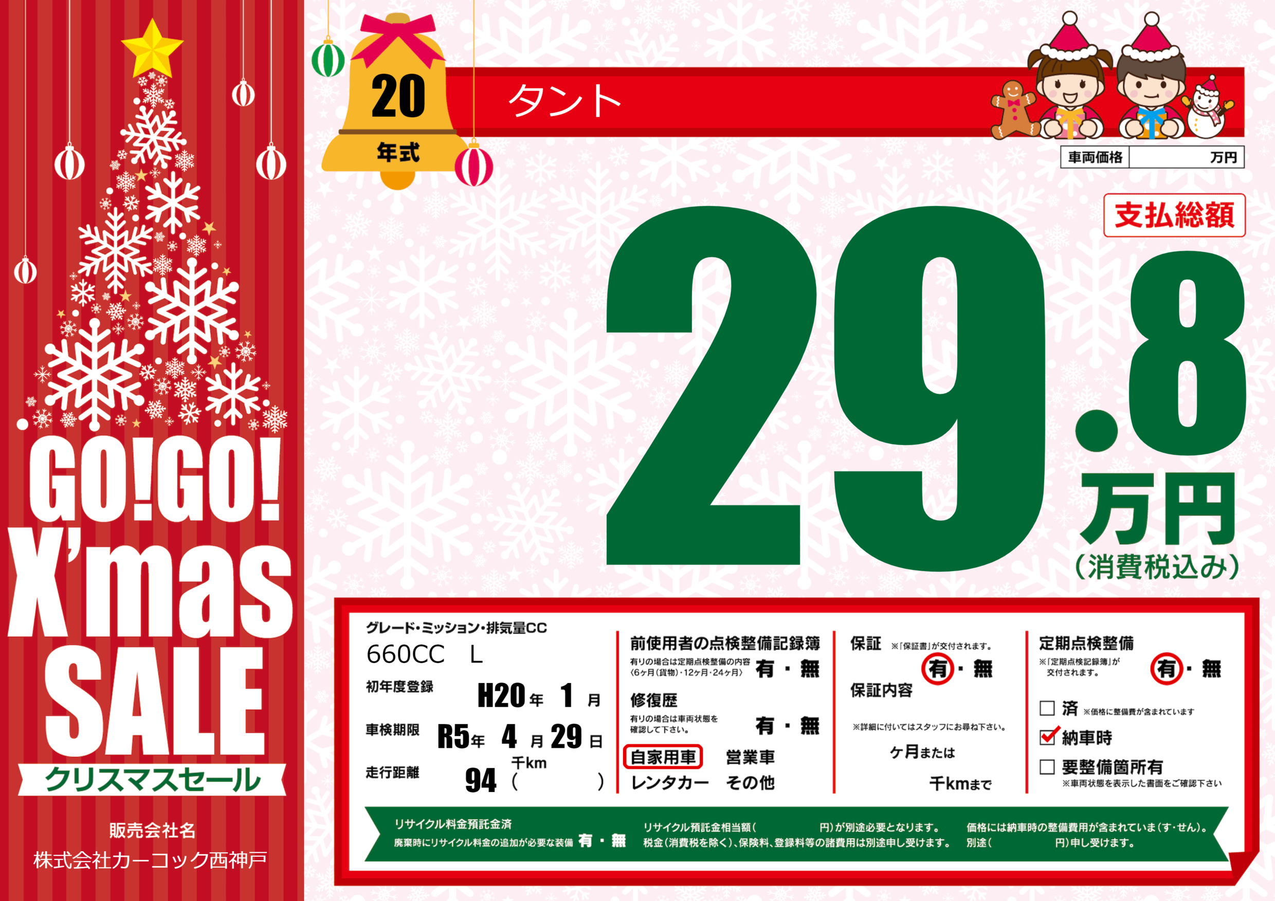 | 定期点検整備 | 定期点検整備あり 納車時あり | ||