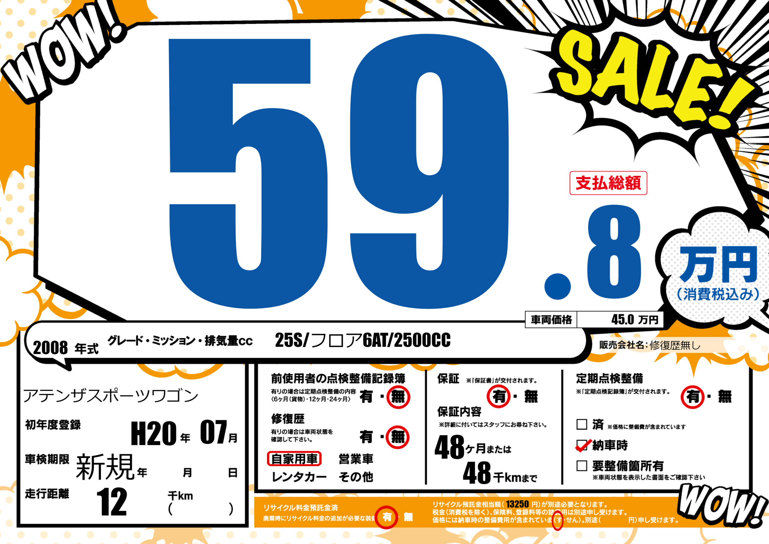 保証付き 保証内容(---) 48ヶ月または(48)千kmまで |