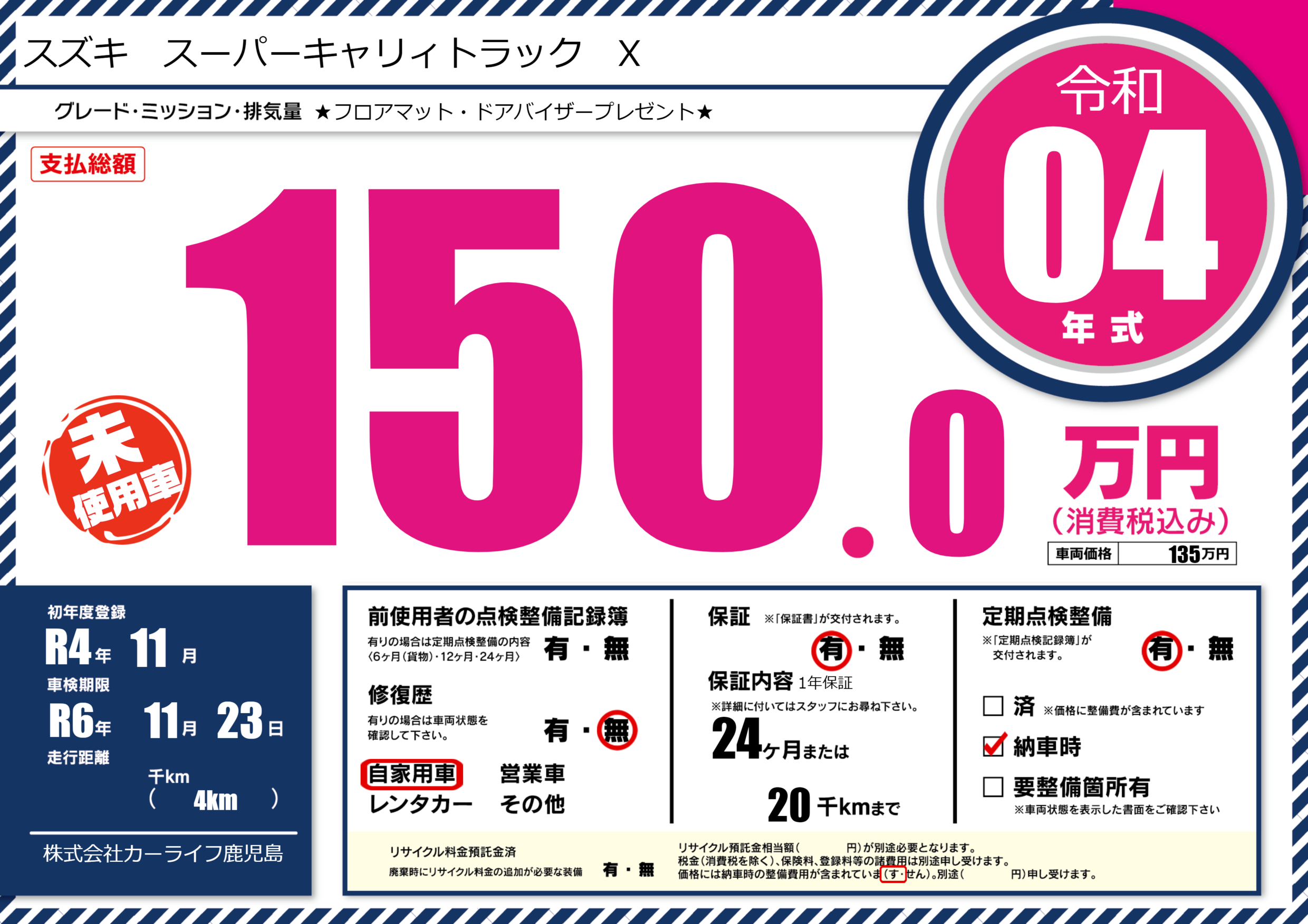 | 走行キロ | - | 初年度登録 | R4年11月 |