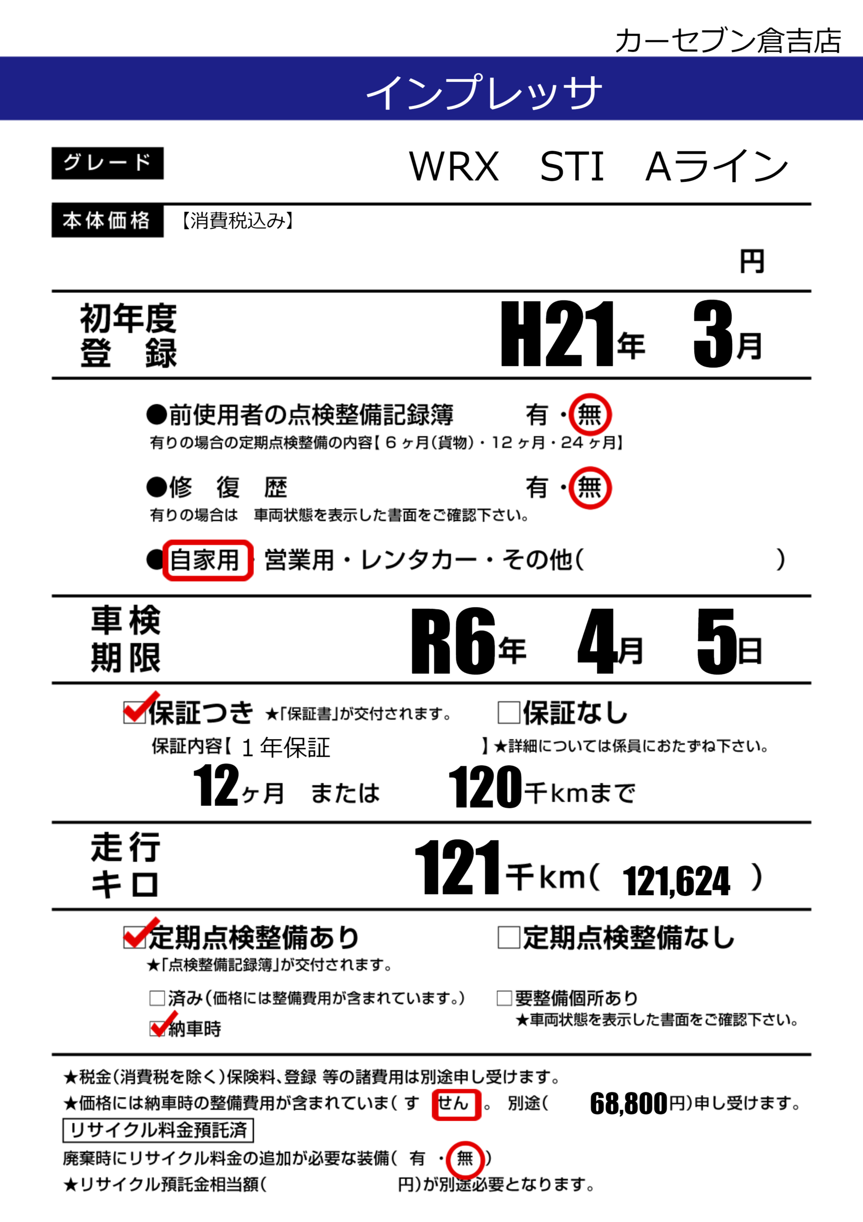 | 車名 | インプレッサ | グレード ミッション 排気量 |