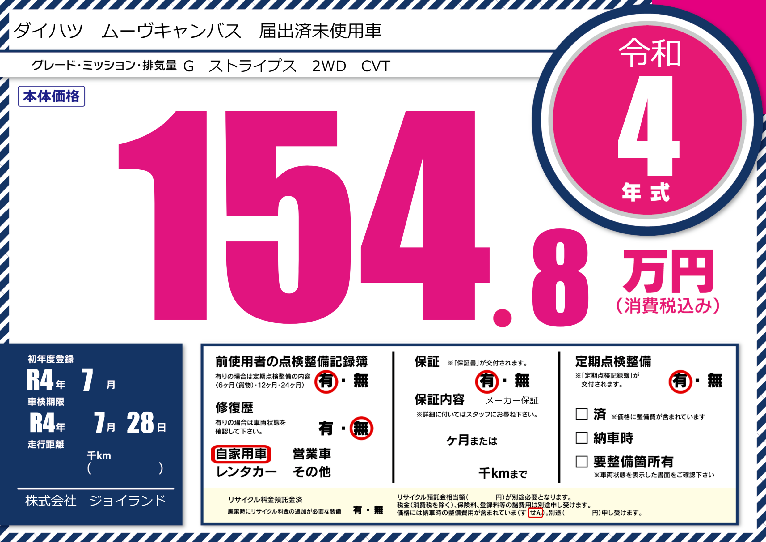| 車名 | ダイハツ ムーヴキャンバス 届出済未使用車 | グレード ミッション 排気量 |