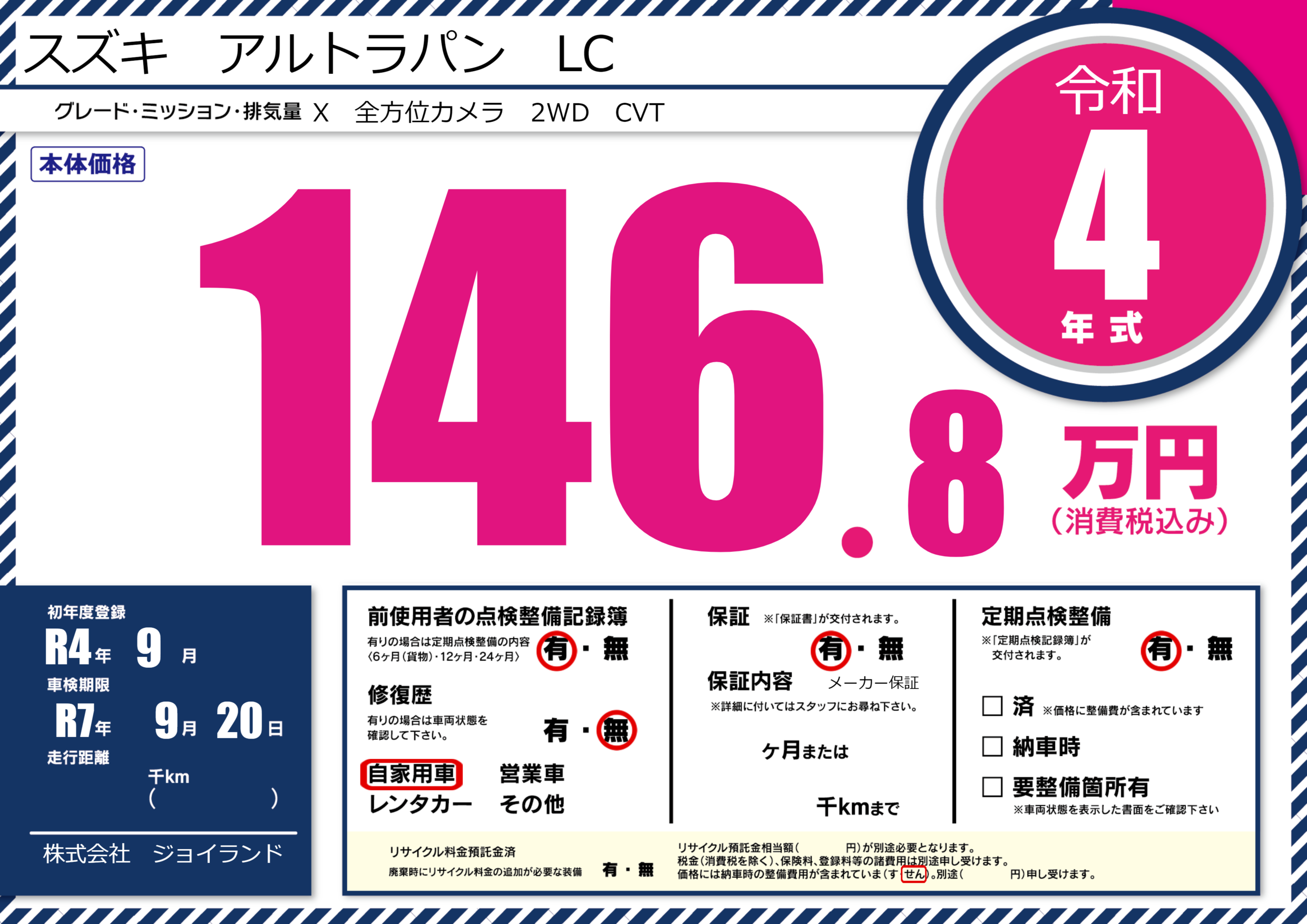 | 車名 | スズキ アルトラパン LC | グレード ミッション 排気量 |