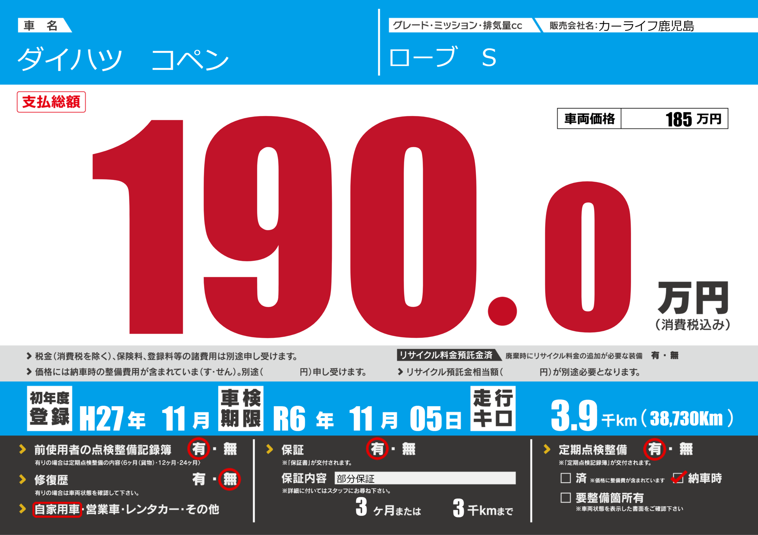| 車名 | ダイハツ コペン | グレード ミッション 排気量 |
