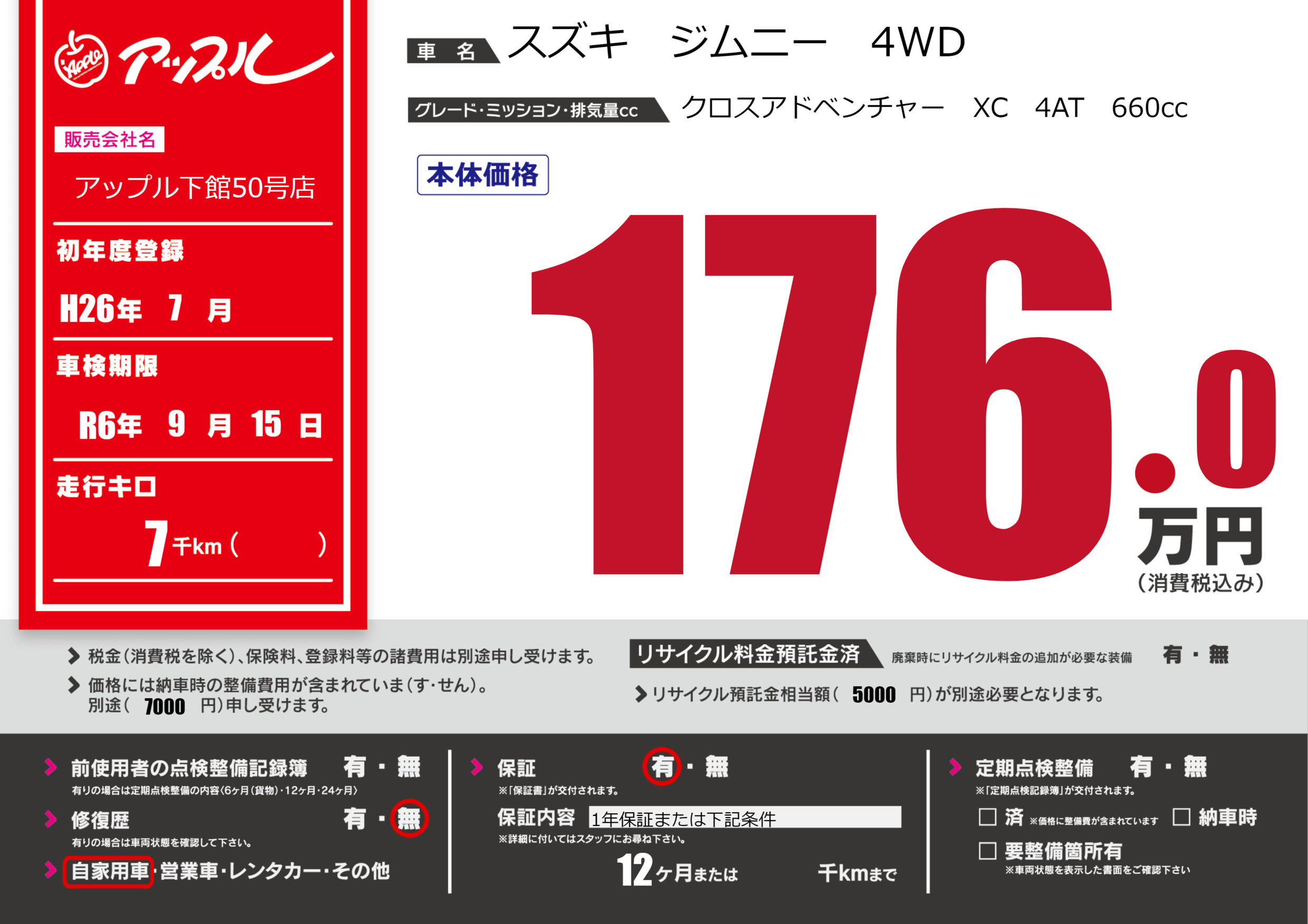 | 車名 | スズキ ジムニー 4WD | グレード ミッション 排気量 |