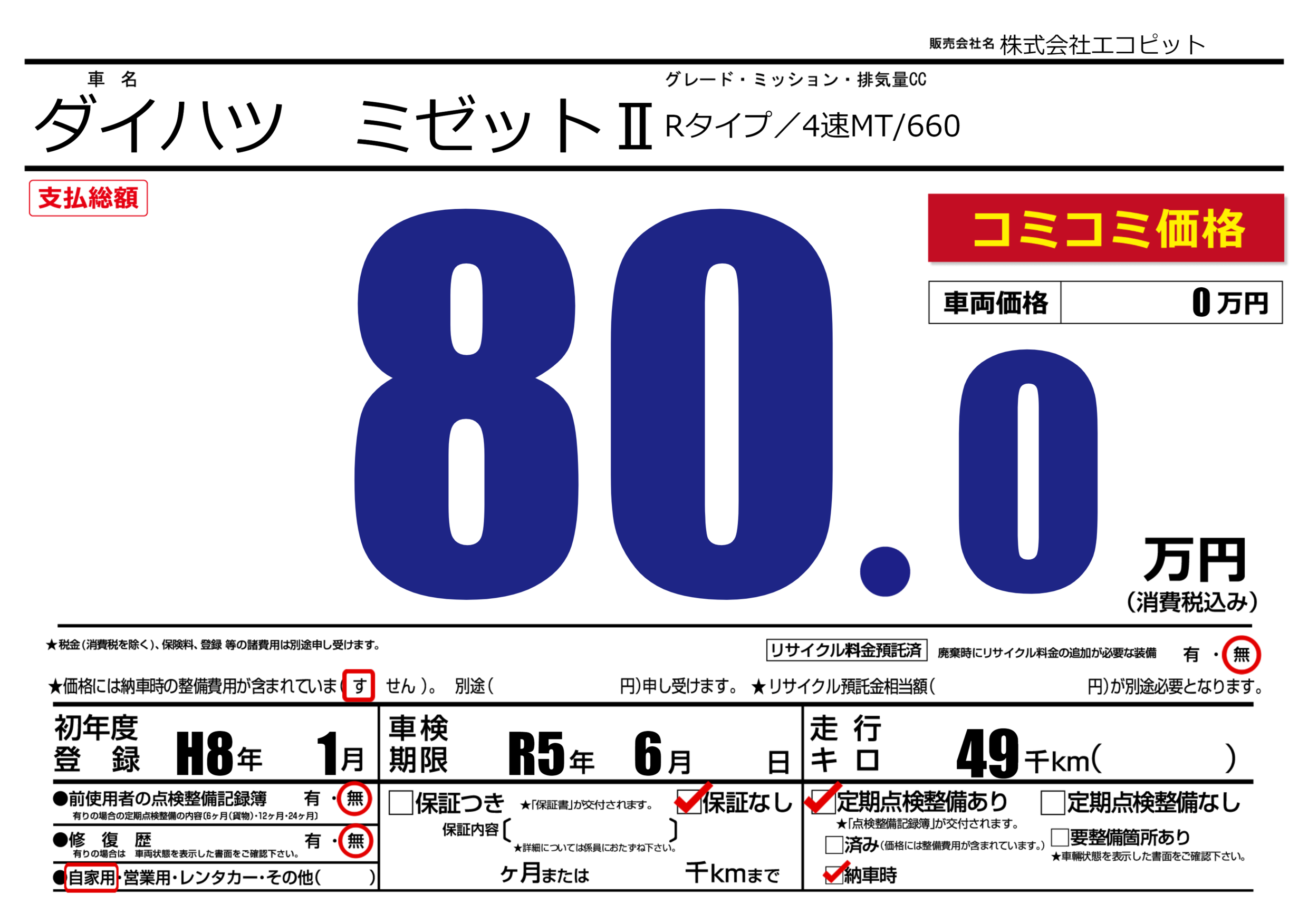 | 走行キロ | 4.9万km | 初年度登録 | H8年1月 |