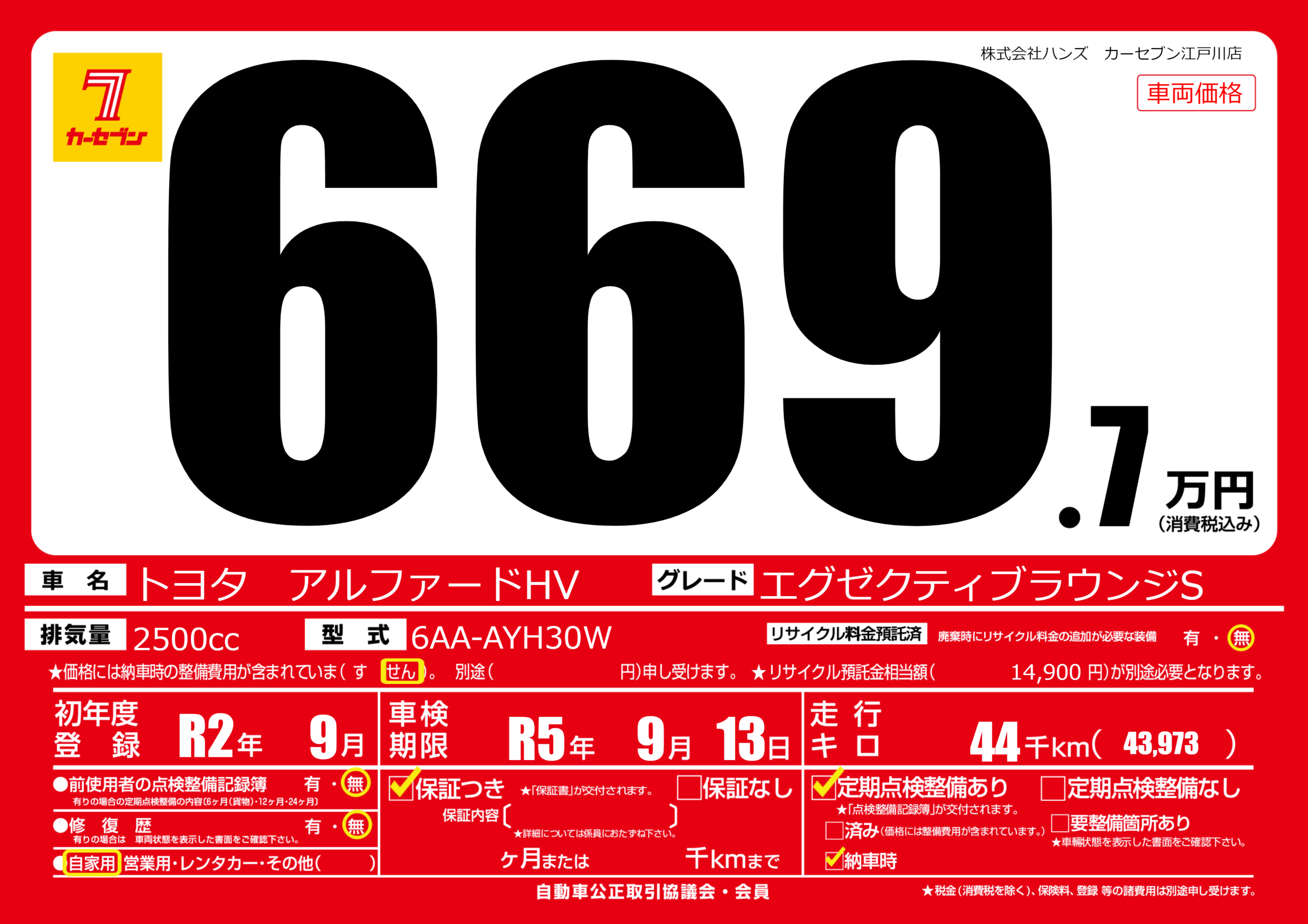| 車名 | トヨタ アルファードHV | グレード ミッション 排気量 |