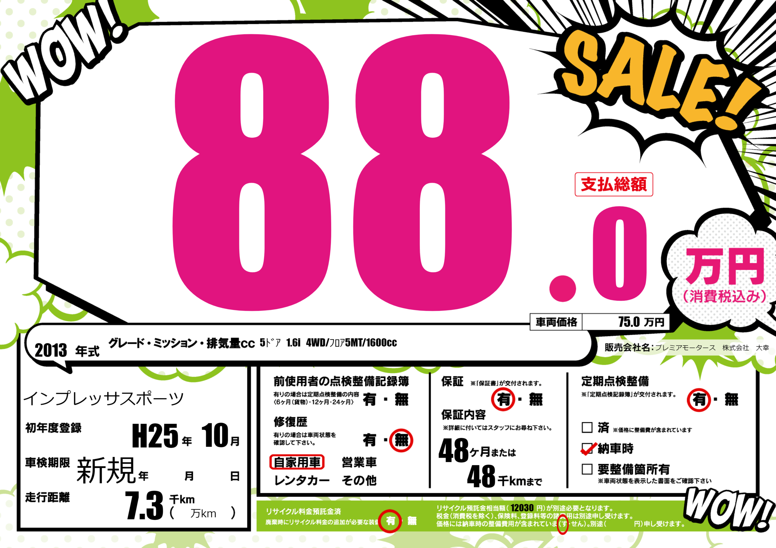 | 車名 | インプレッサスポーツ | グレード ミッション 排気量 |