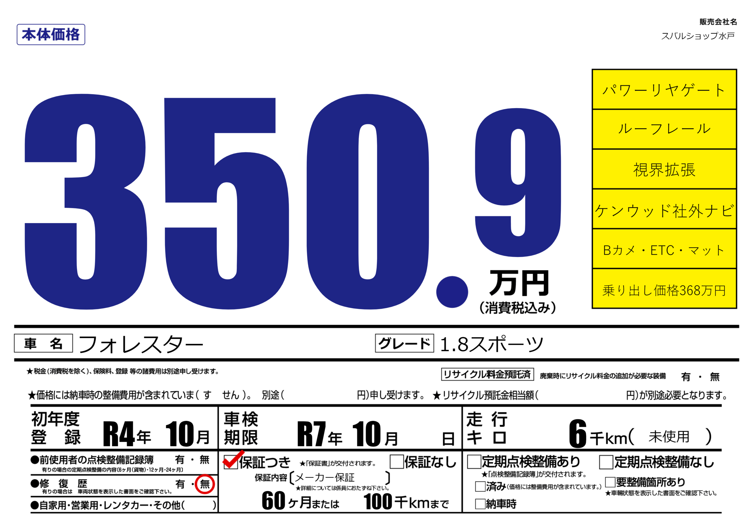 | 車名 | フォレスター | グレード ミッション 排気量 |
