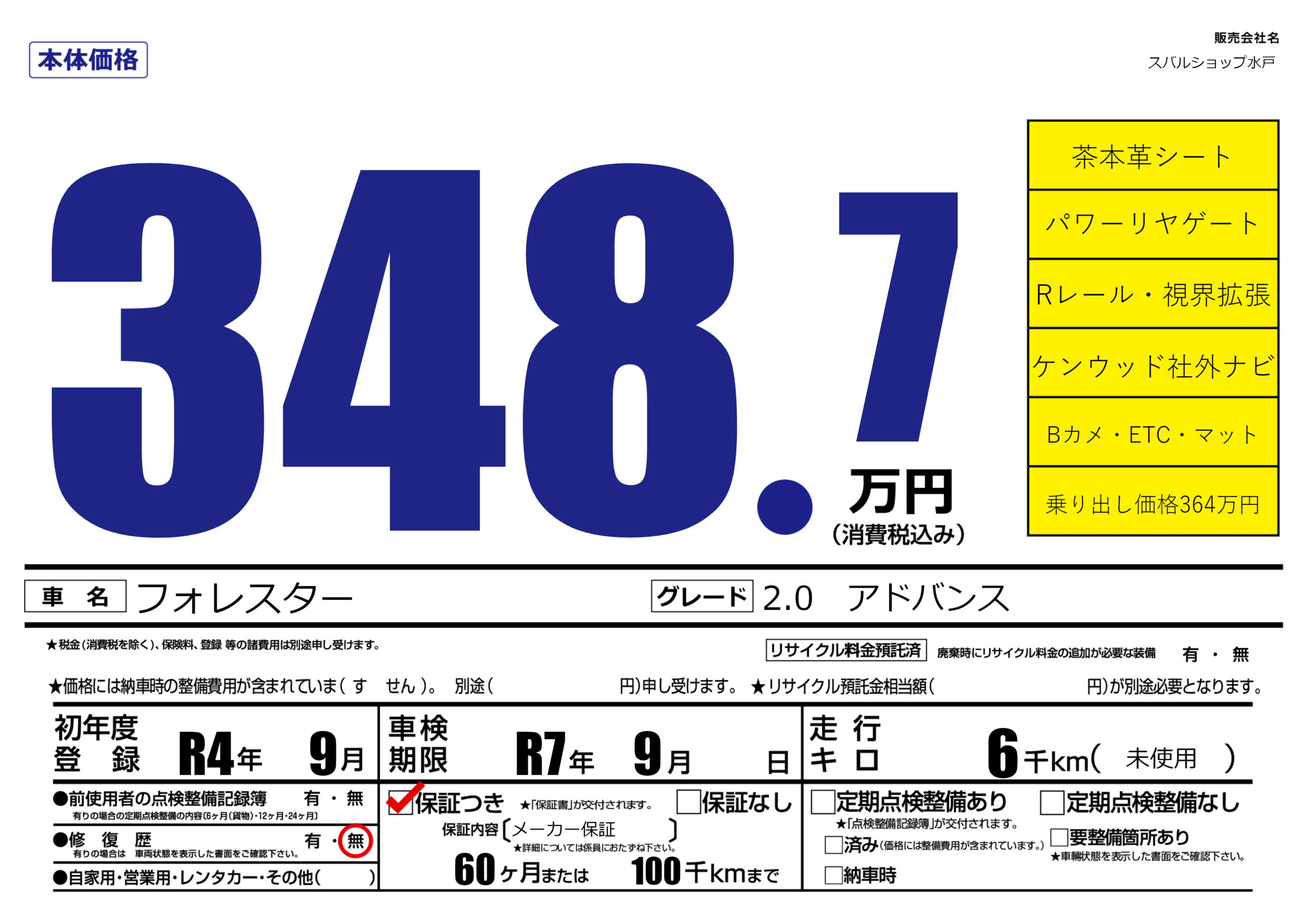 | 車名 | フォレスター | グレード ミッション 排気量 |