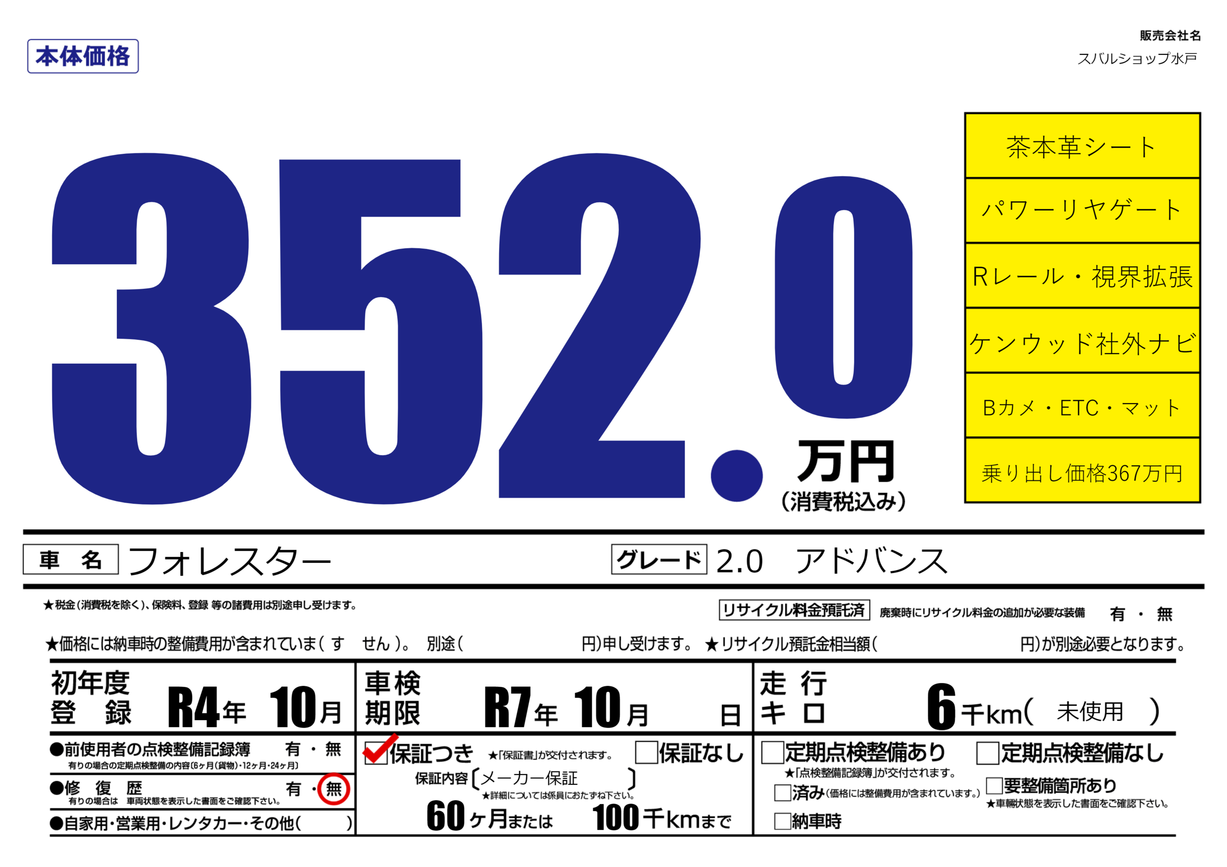 | 車名 | フォレスター | グレード ミッション 排気量 |