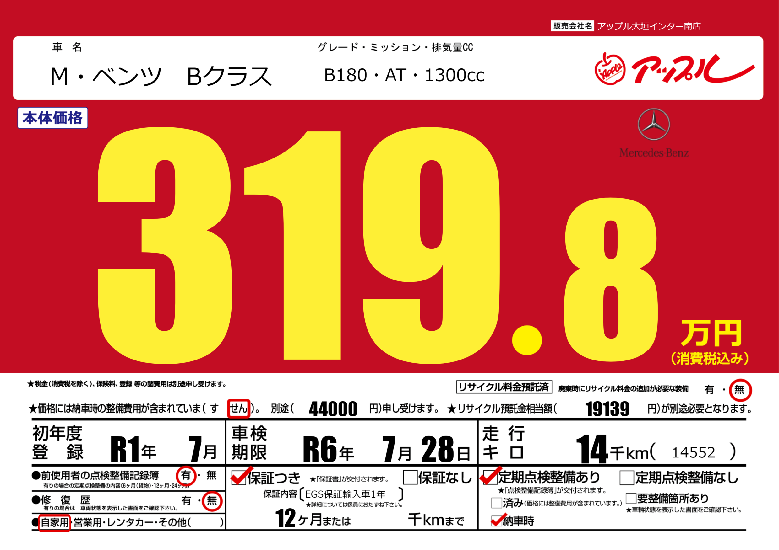 | 車名 | M・ベンツ Bクラス | グレード ミッション 排気量 |