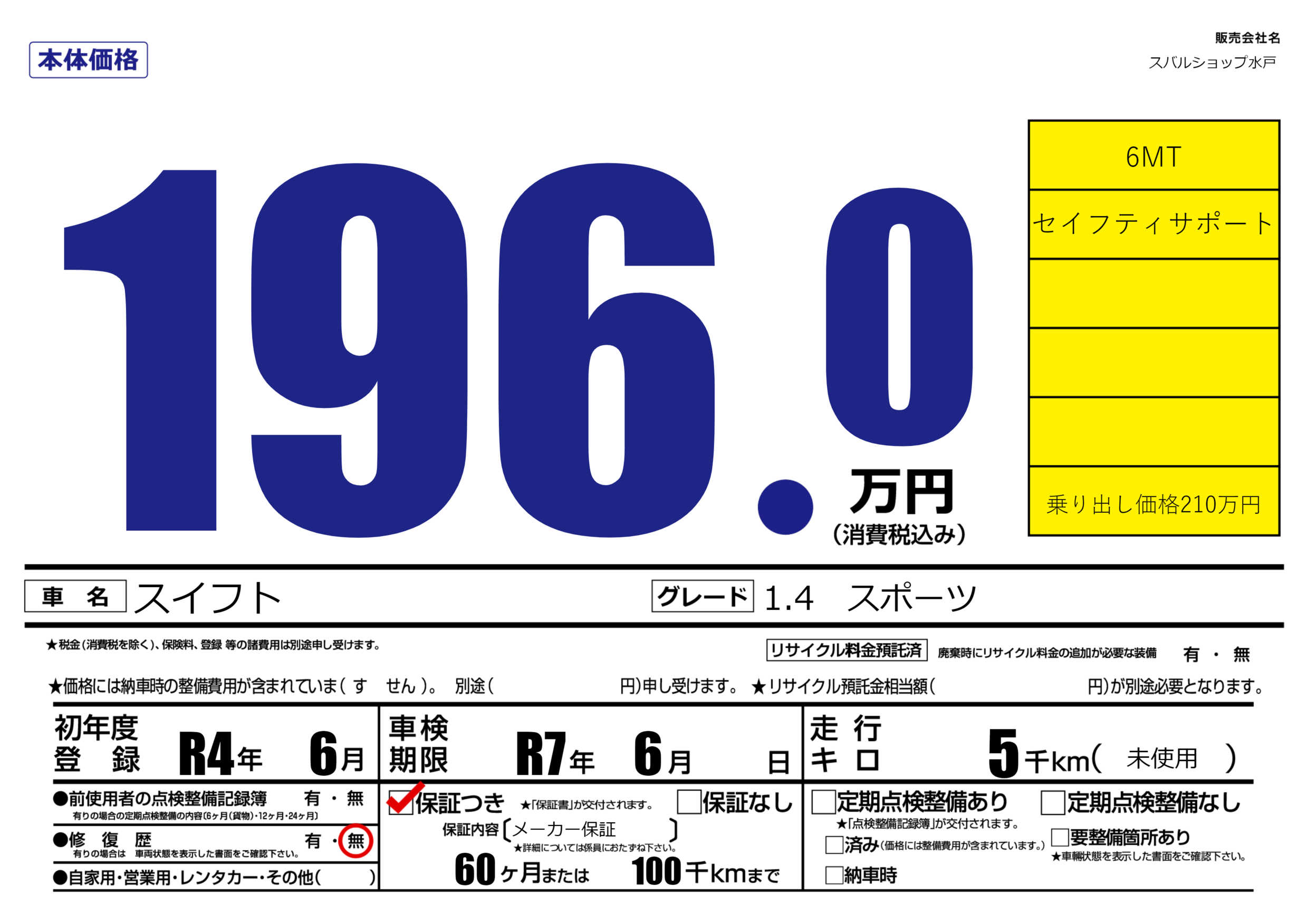 | 車名 | スイフト | グレード ミッション 排気量 |