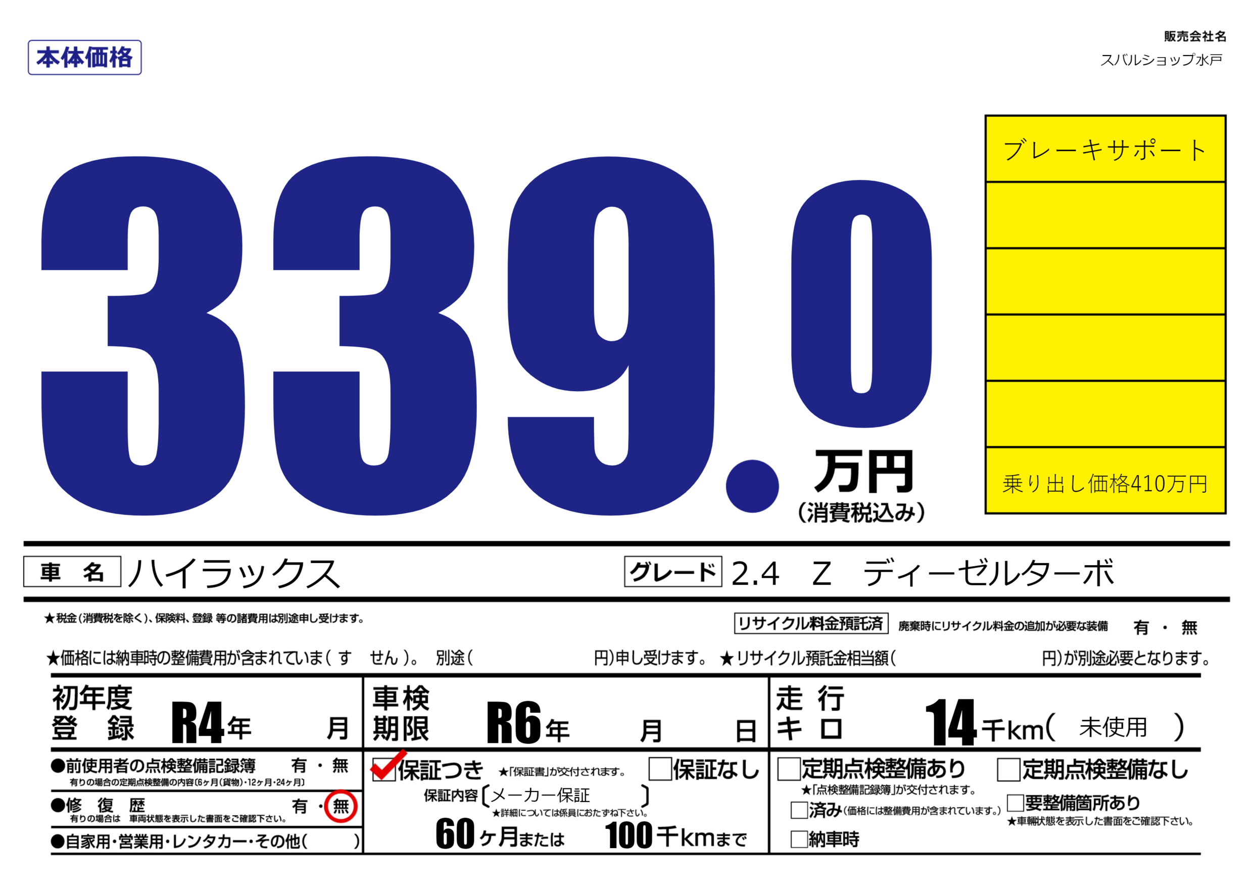 | 車名 | ハイラックス | グレード ミッション 排気量 |