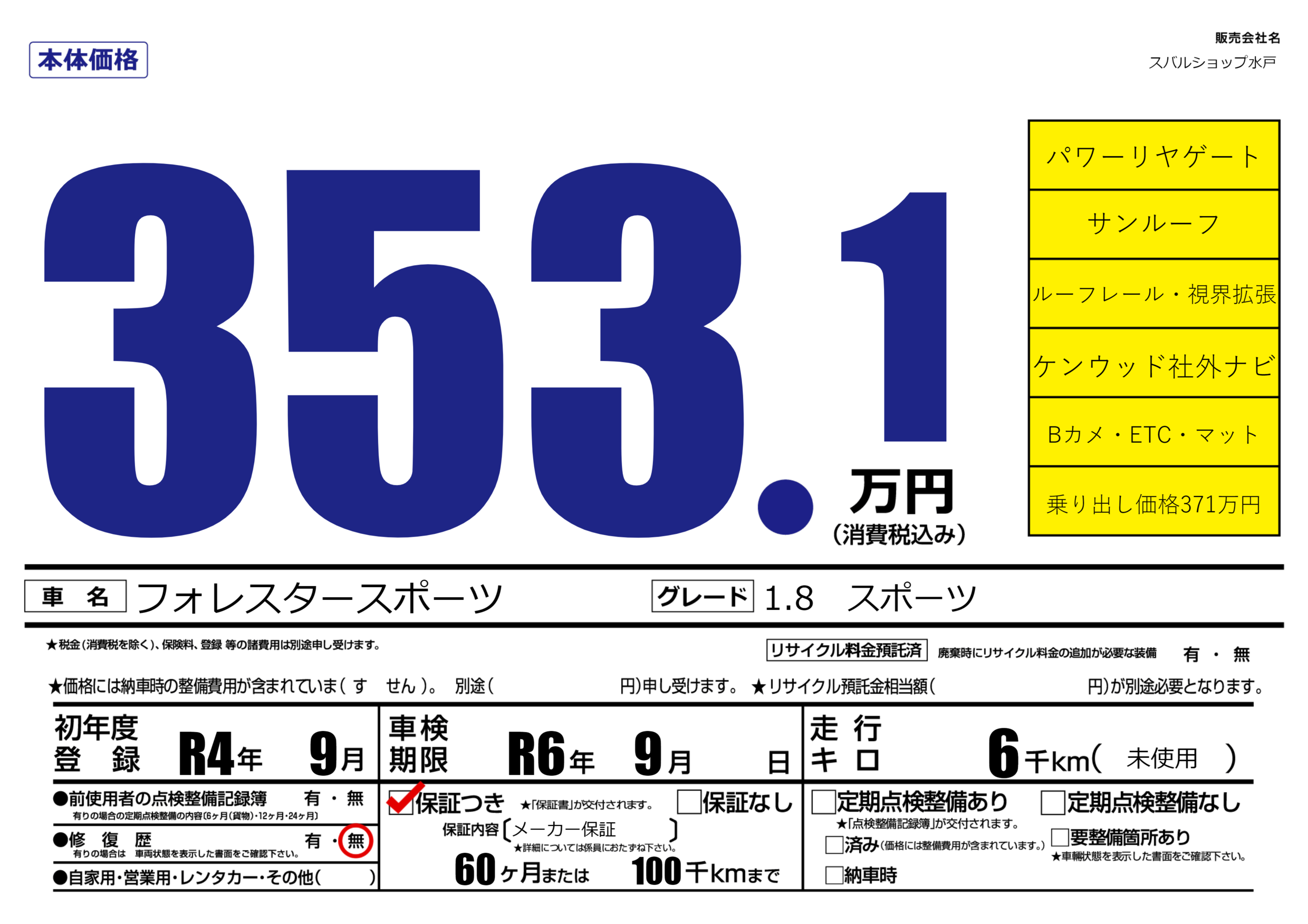 | 車検制限 | R6年 9月 - 日 | ||