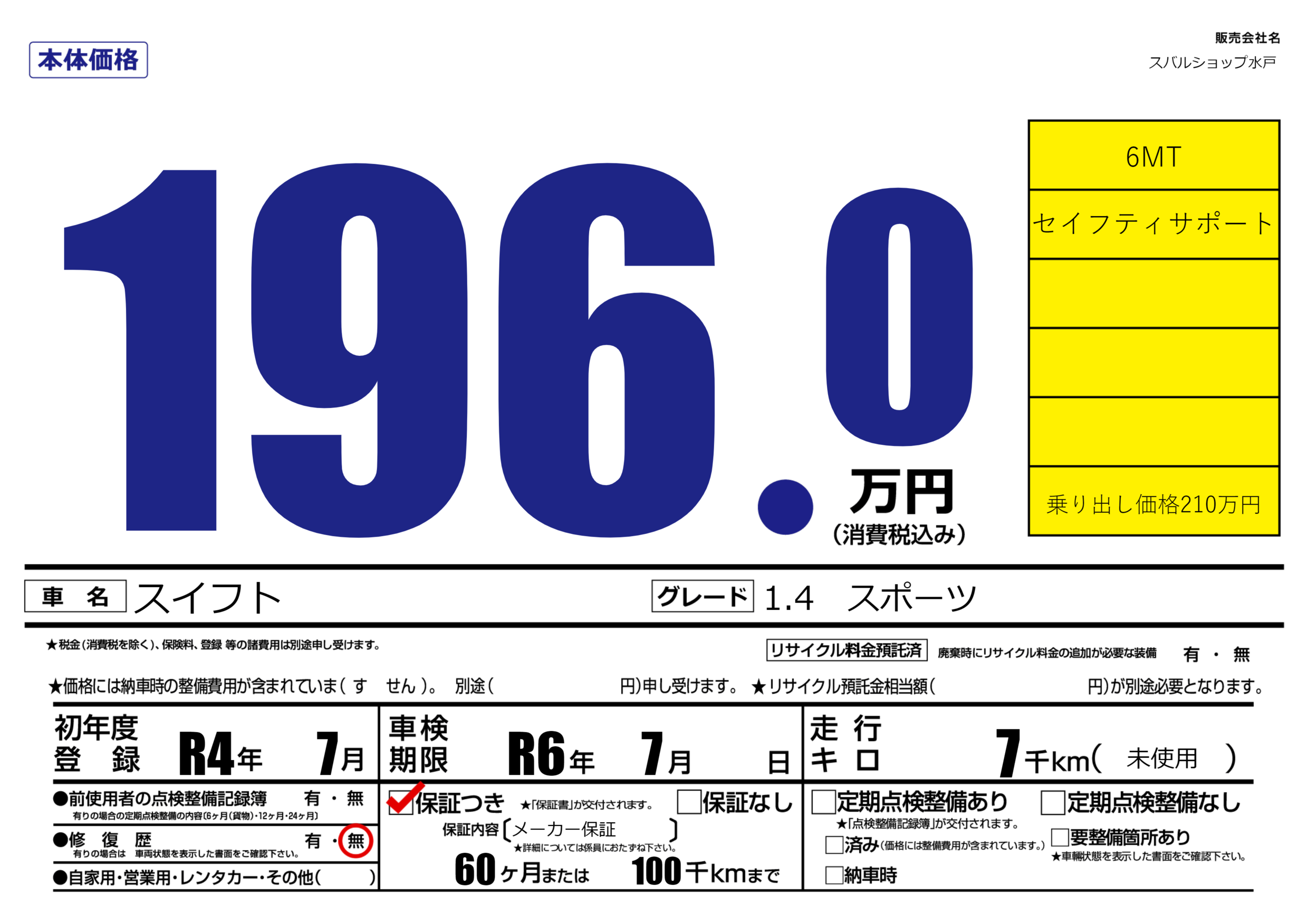 | 車名 | スイフト | グレード ミッション 排気量 |