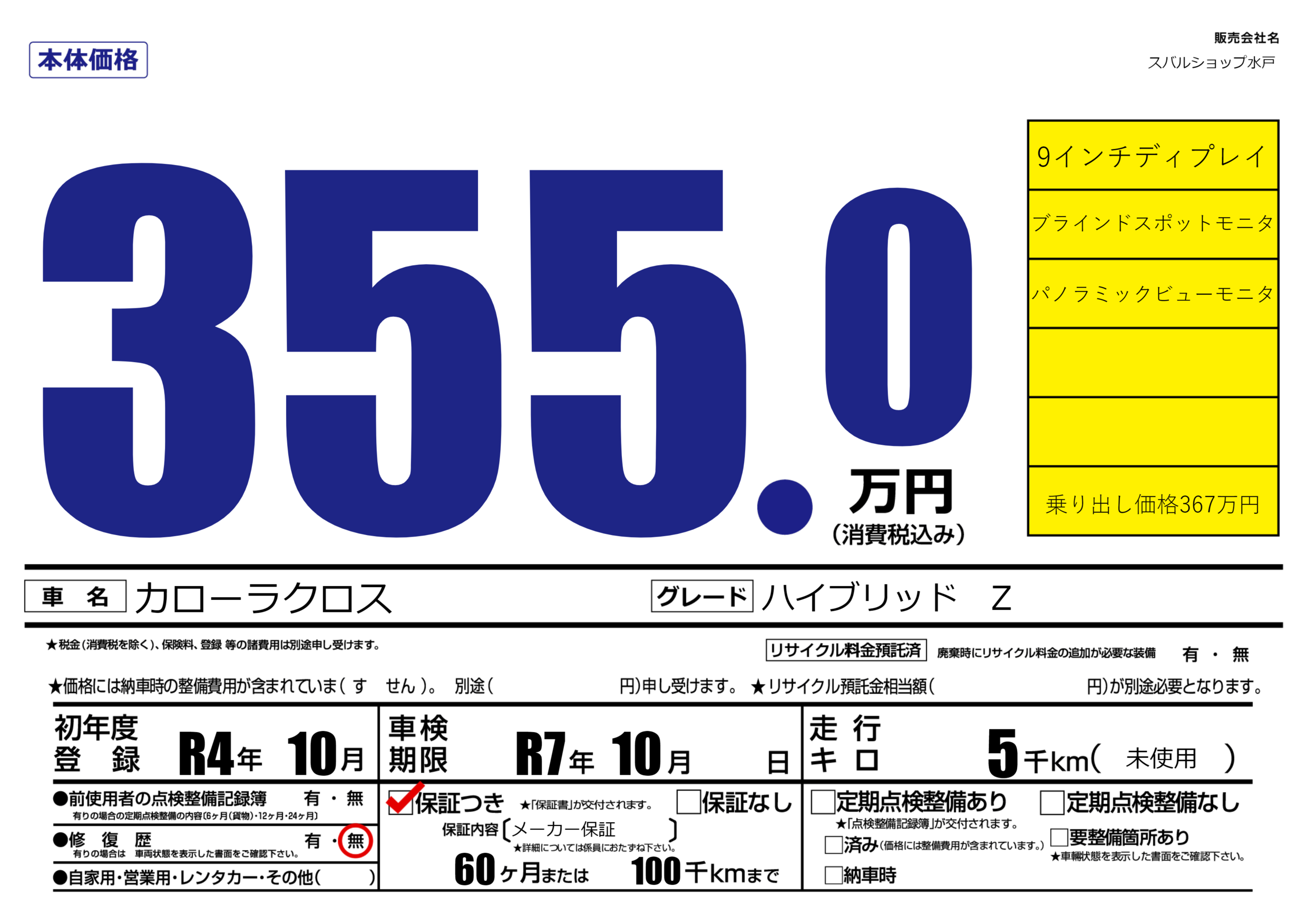 | 走行キロ | 0.5万km | 初年度登録 | R4年10月 |