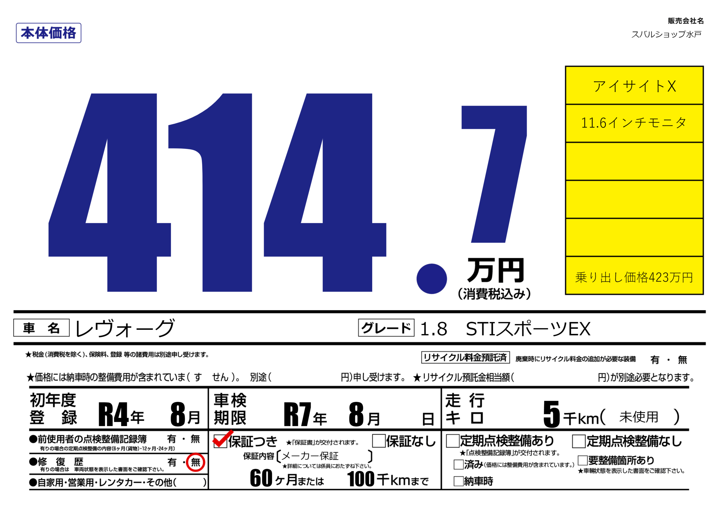 | 車名 | レヴォーグ | グレード ミッション 排気量 |