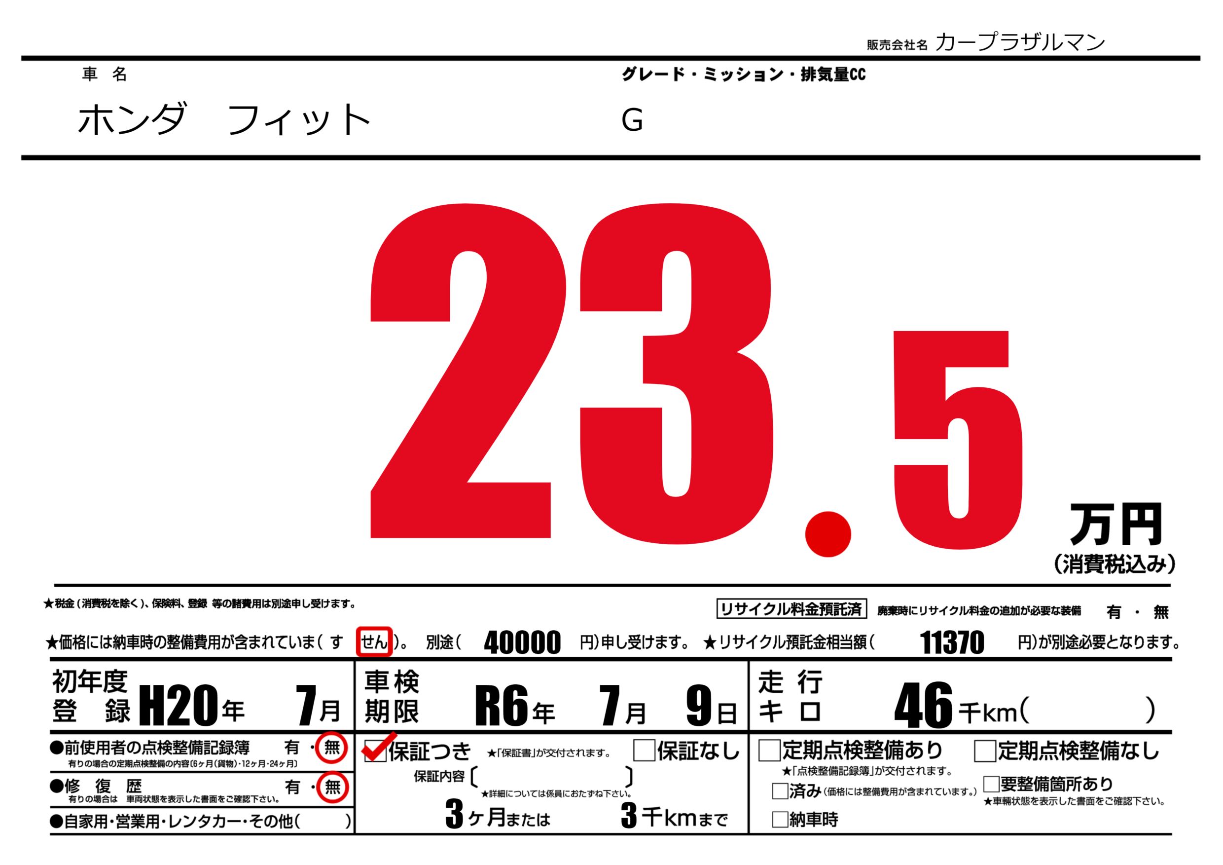 | 車名 | ホンダ フィット | グレード ミッション 排気量 |