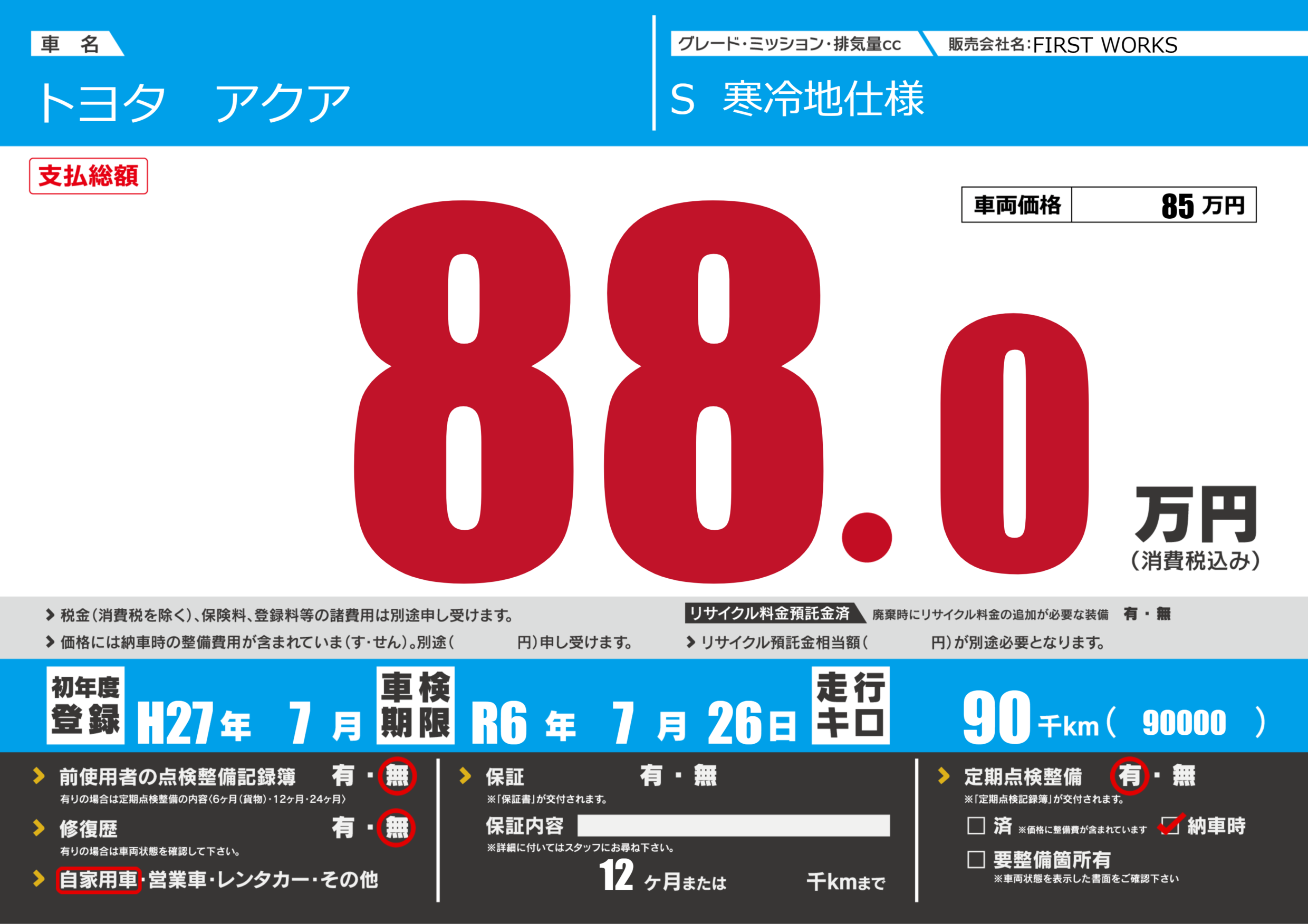 | 定期点検整備 | 定期点検整備あり 納車時あり | ||