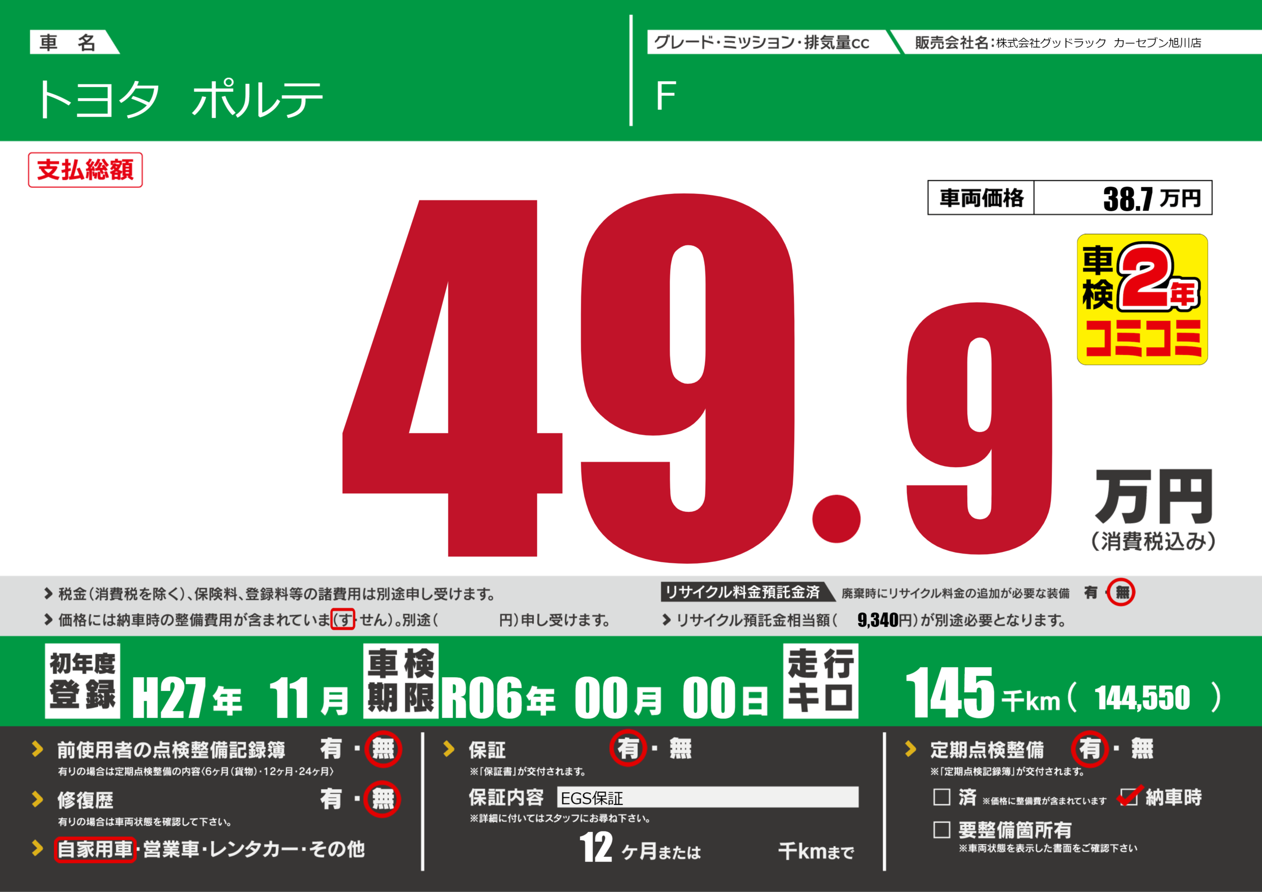 保証付き 保証内容(EGS保証) 12ヶ月または()千kmまで |