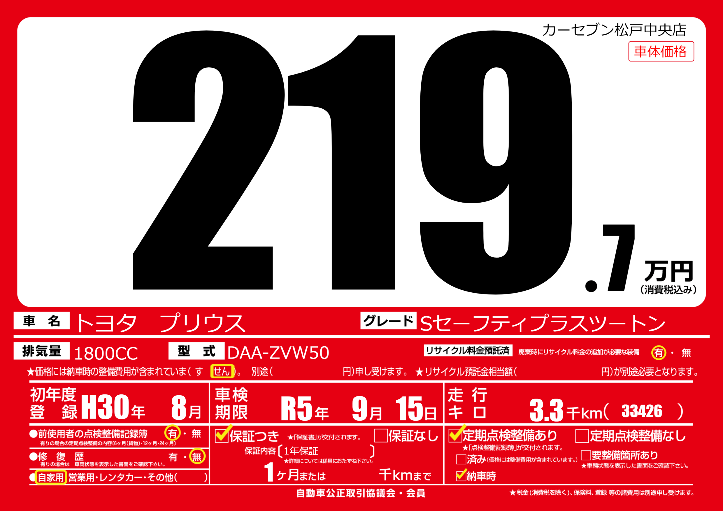 | 車名 | トヨタ プリウス | グレード ミッション 排気量 |