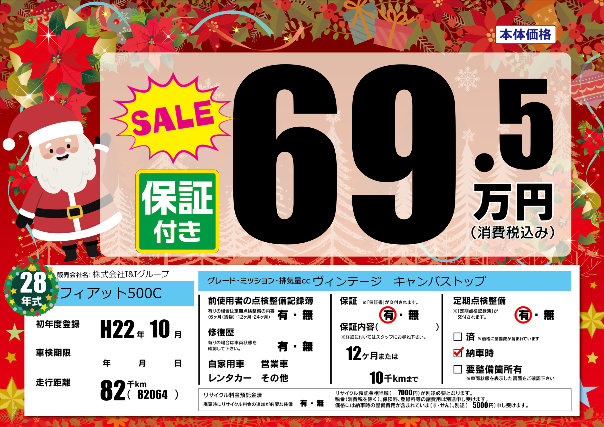 | 車名 | フィアット500C | グレード ミッション 排気量 |
