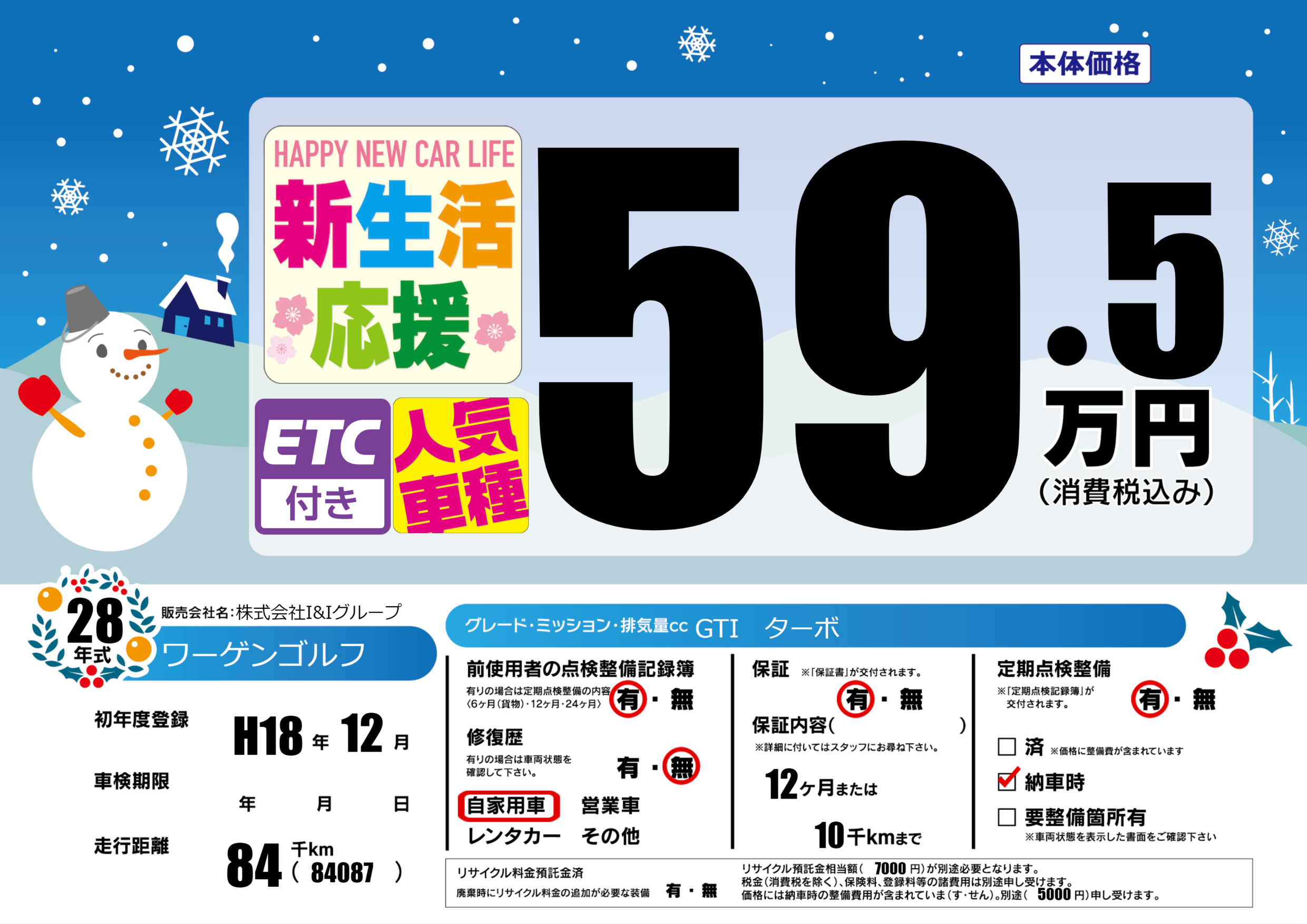 | 車名 | ワーゲンゴルフ | グレード ミッション 排気量 |