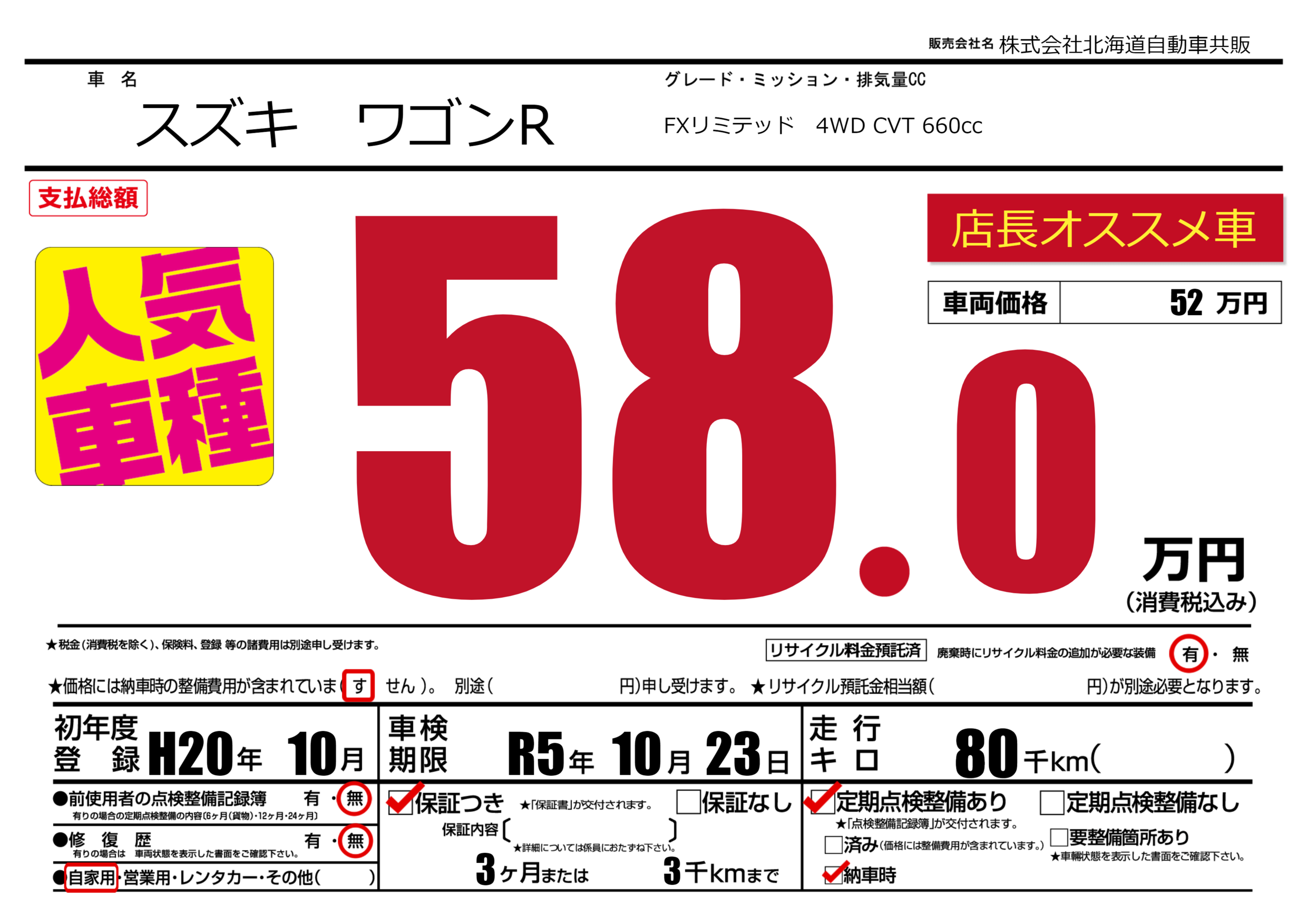 | 走行キロ | 8万km | 初年度登録 | H20年10月 |