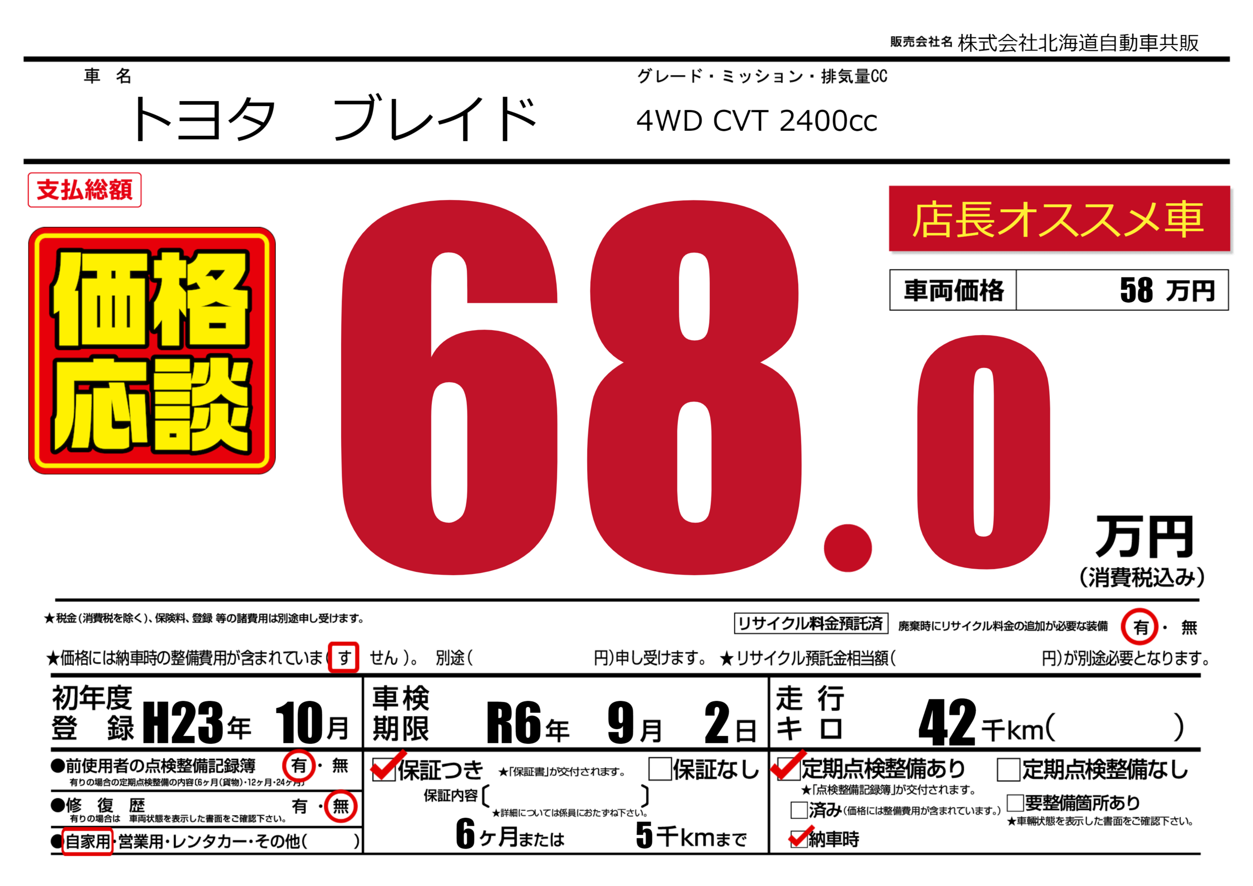 | 車名 | トヨタ ブレイド | グレード ミッション 排気量 |