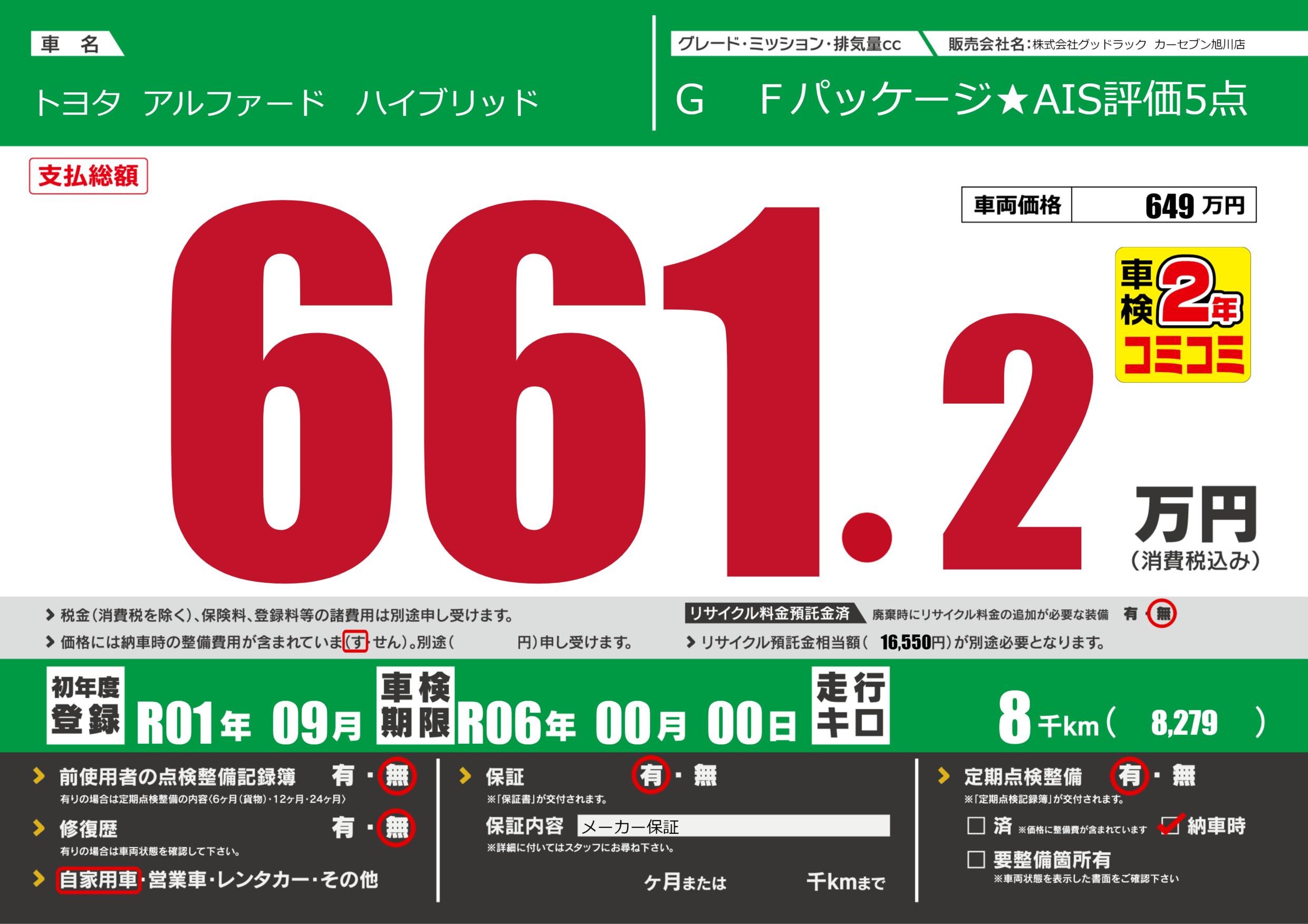 | 走行キロ | 0.8万km | 初年度登録 | R01年09月 |