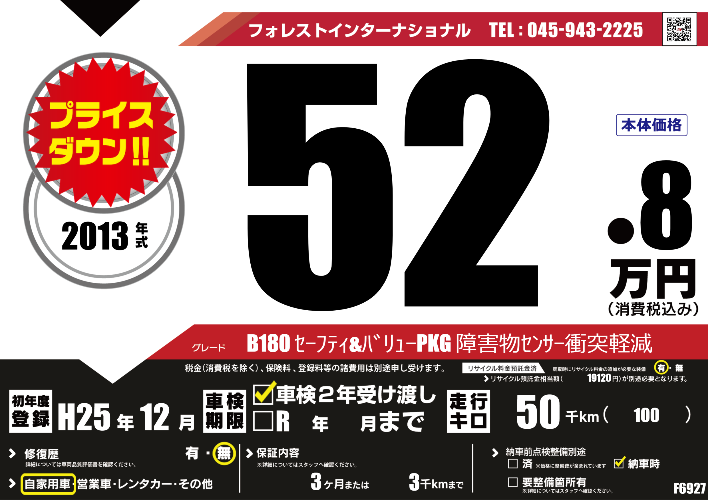 | 走行キロ | 5万km | 初年度登録 | H25年12月 |