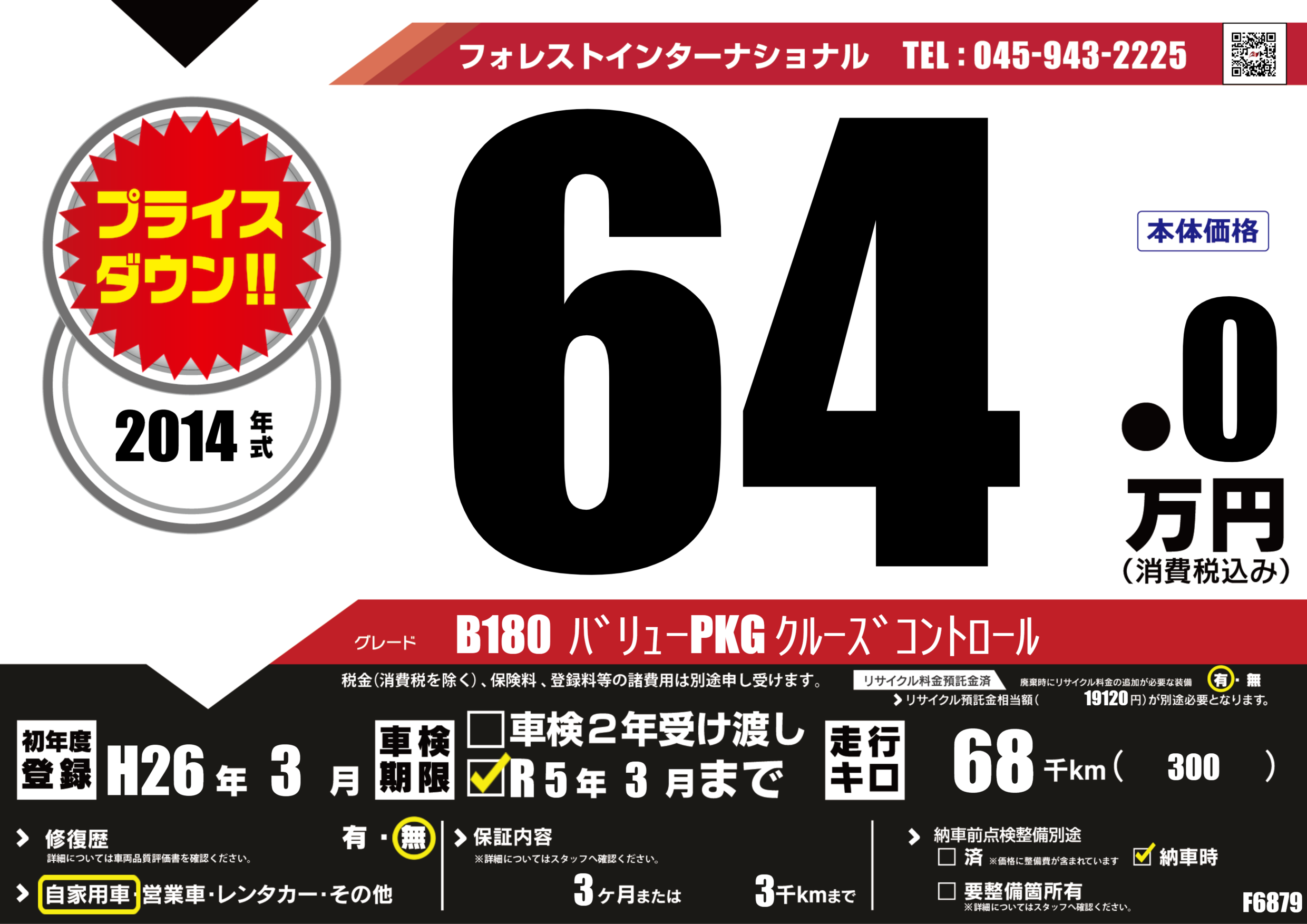 | 走行キロ | 6.8万km | 初年度登録 | H26年3月 |