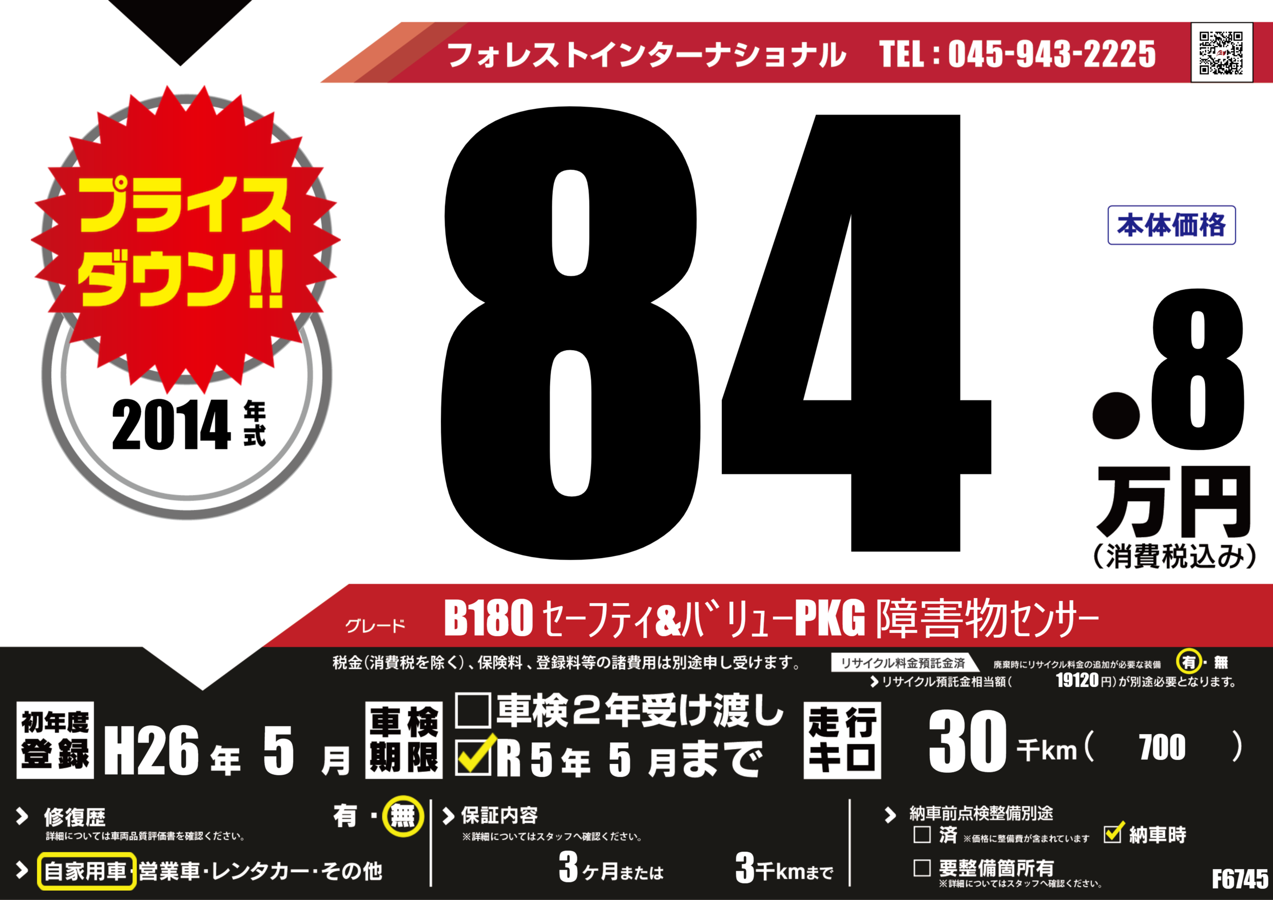 | 走行キロ | 3万km | 初年度登録 | H26年5月 |