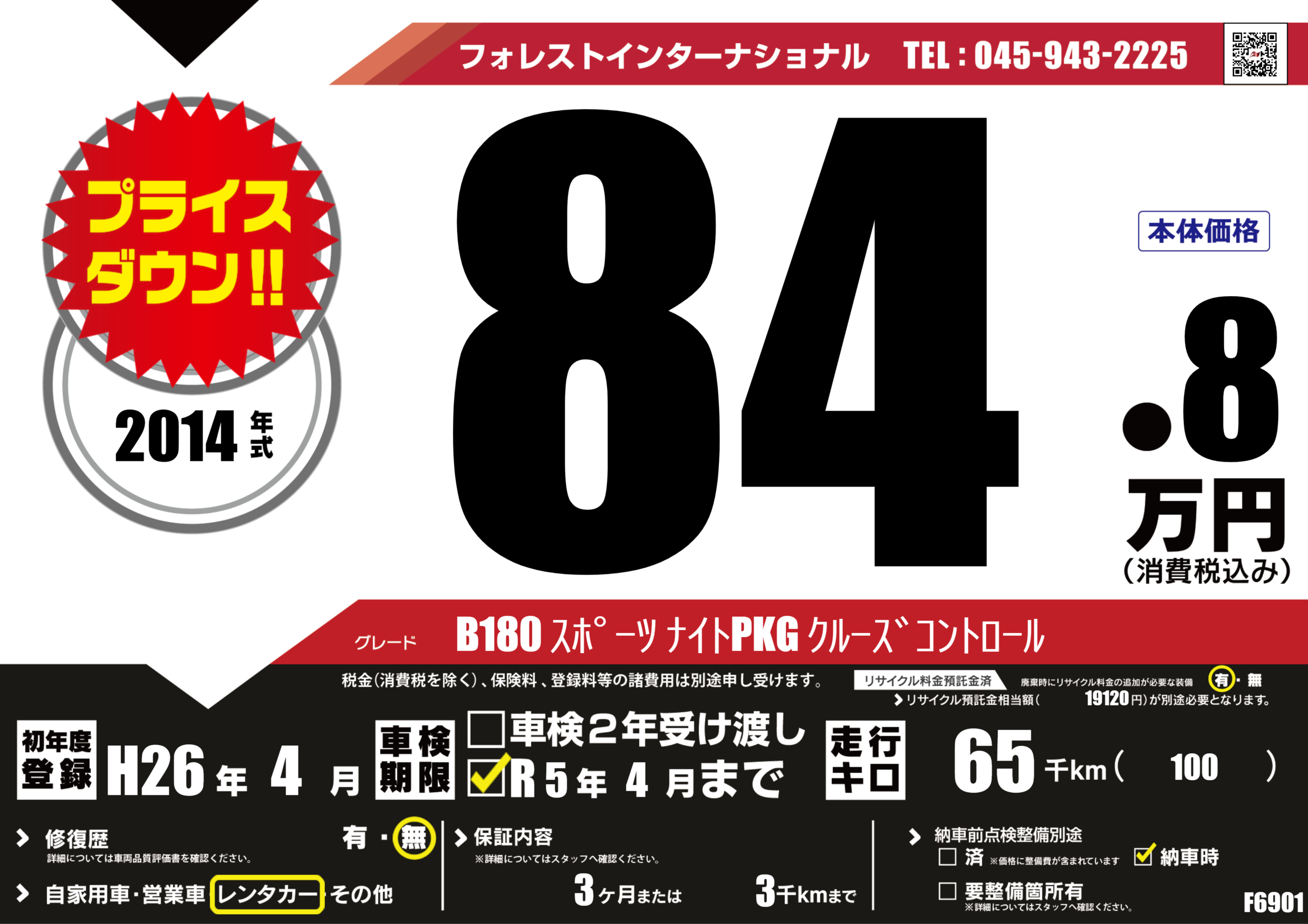 | 走行キロ | 6.5万km | 初年度登録 | H26年4月 |