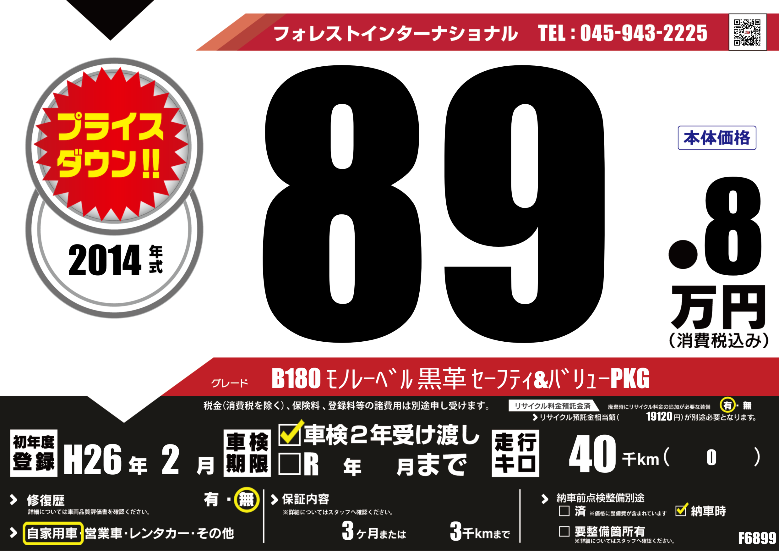 | 走行キロ | 4万km | 初年度登録 | H26年2月 |