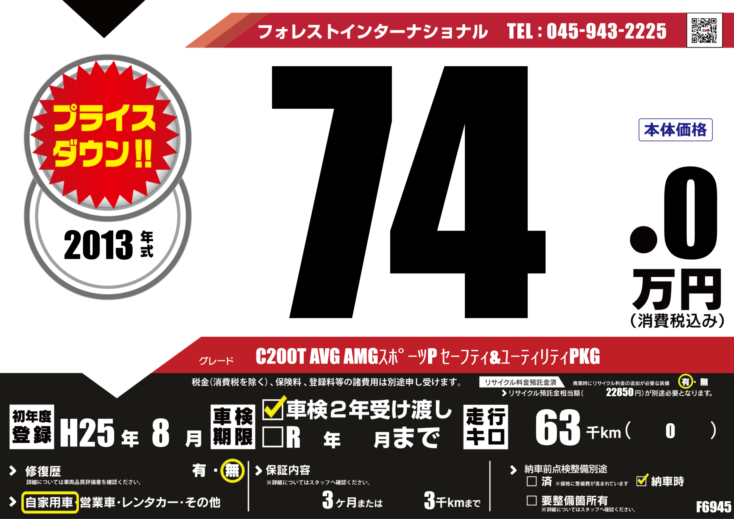 | 走行キロ | 6.3万km | 初年度登録 | H25年8月 |