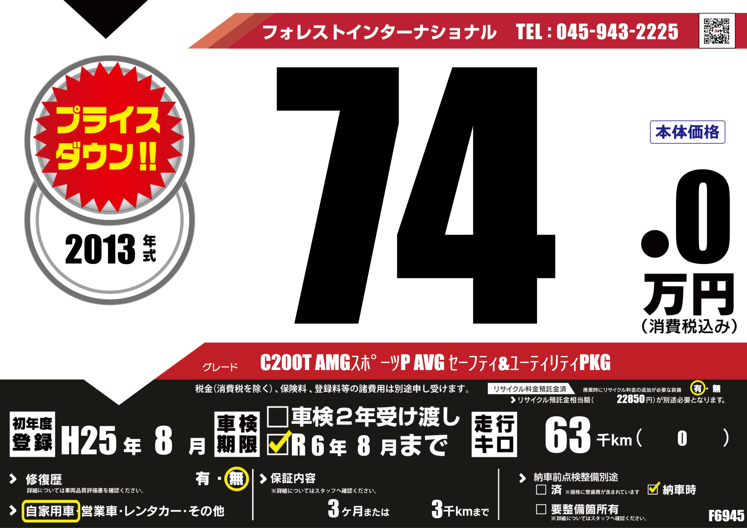 | 走行キロ | 6.3万km | 初年度登録 | H25年8月 |