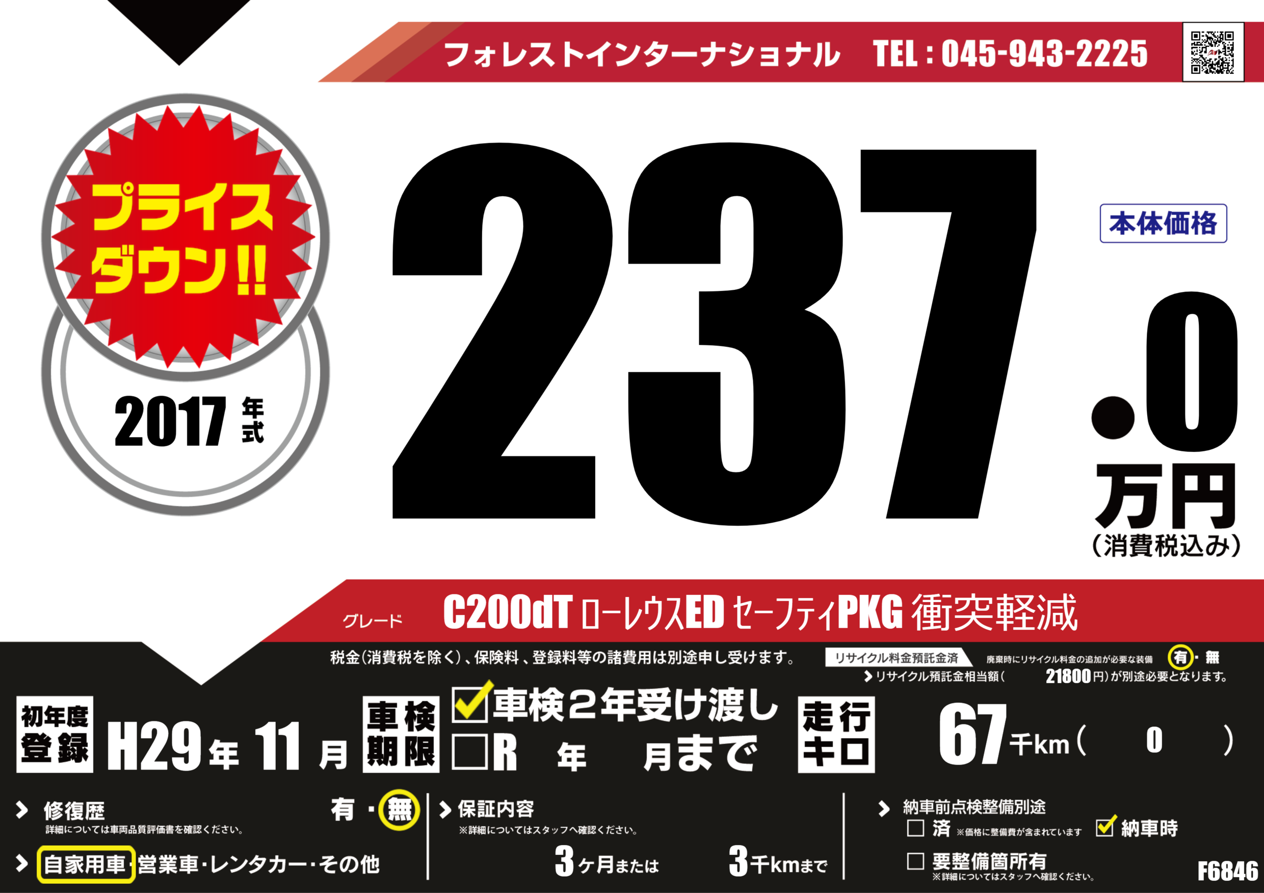 | 走行キロ | 6.7万km | 初年度登録 | H29年11月 |