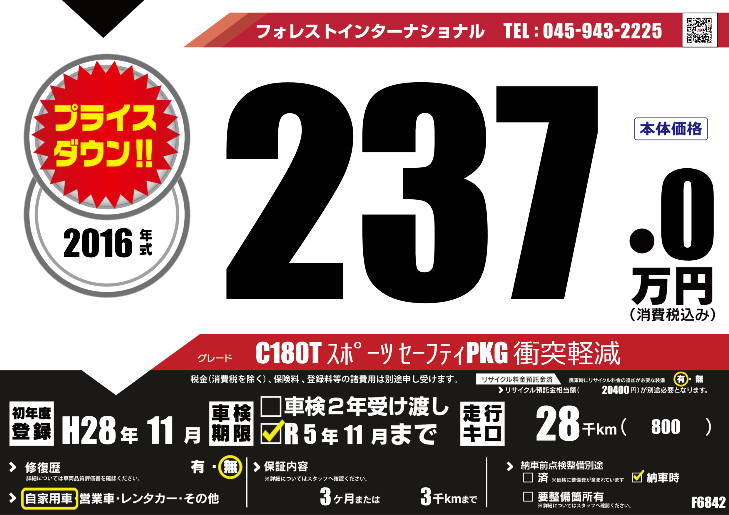 | 走行キロ | 2.8万km | 初年度登録 | H28年11月 |