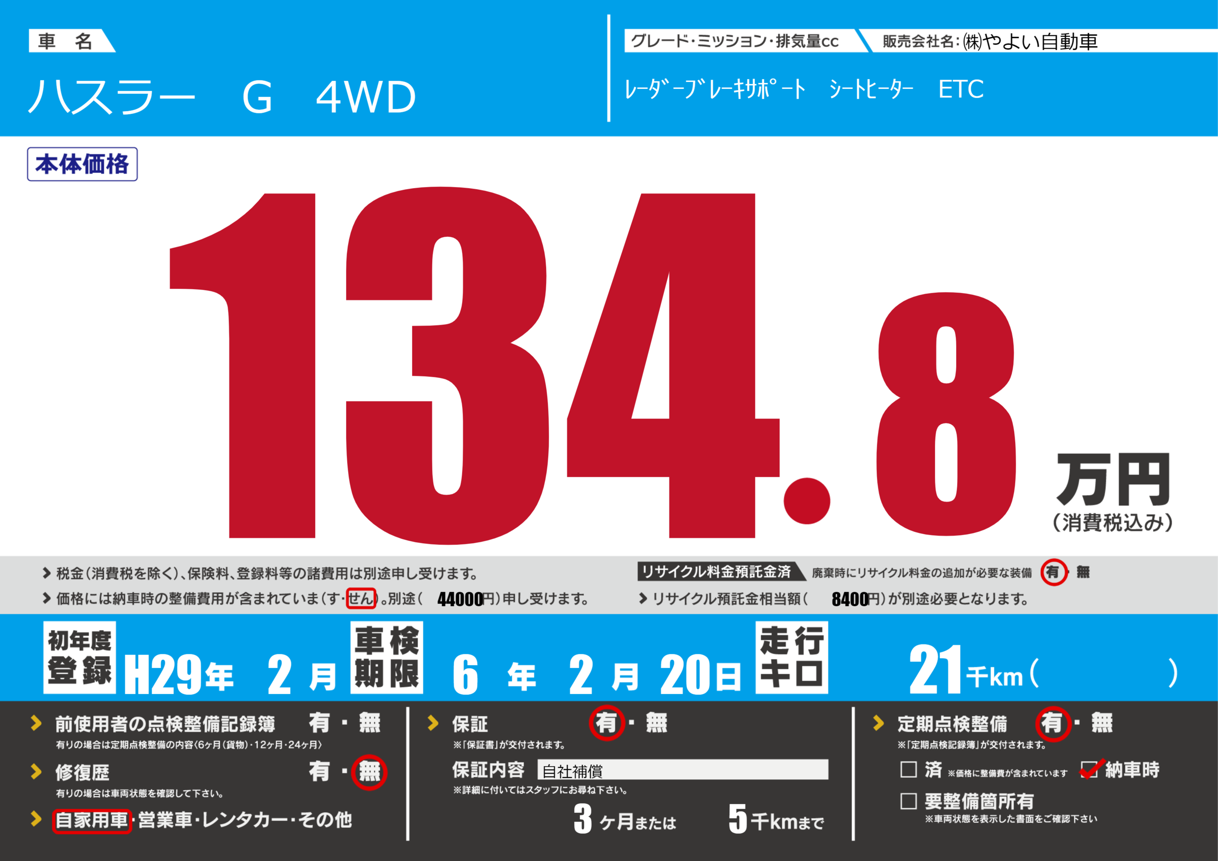 保証付き 保証内容(自社補償) 3ヶ月または(5)千kmまで |