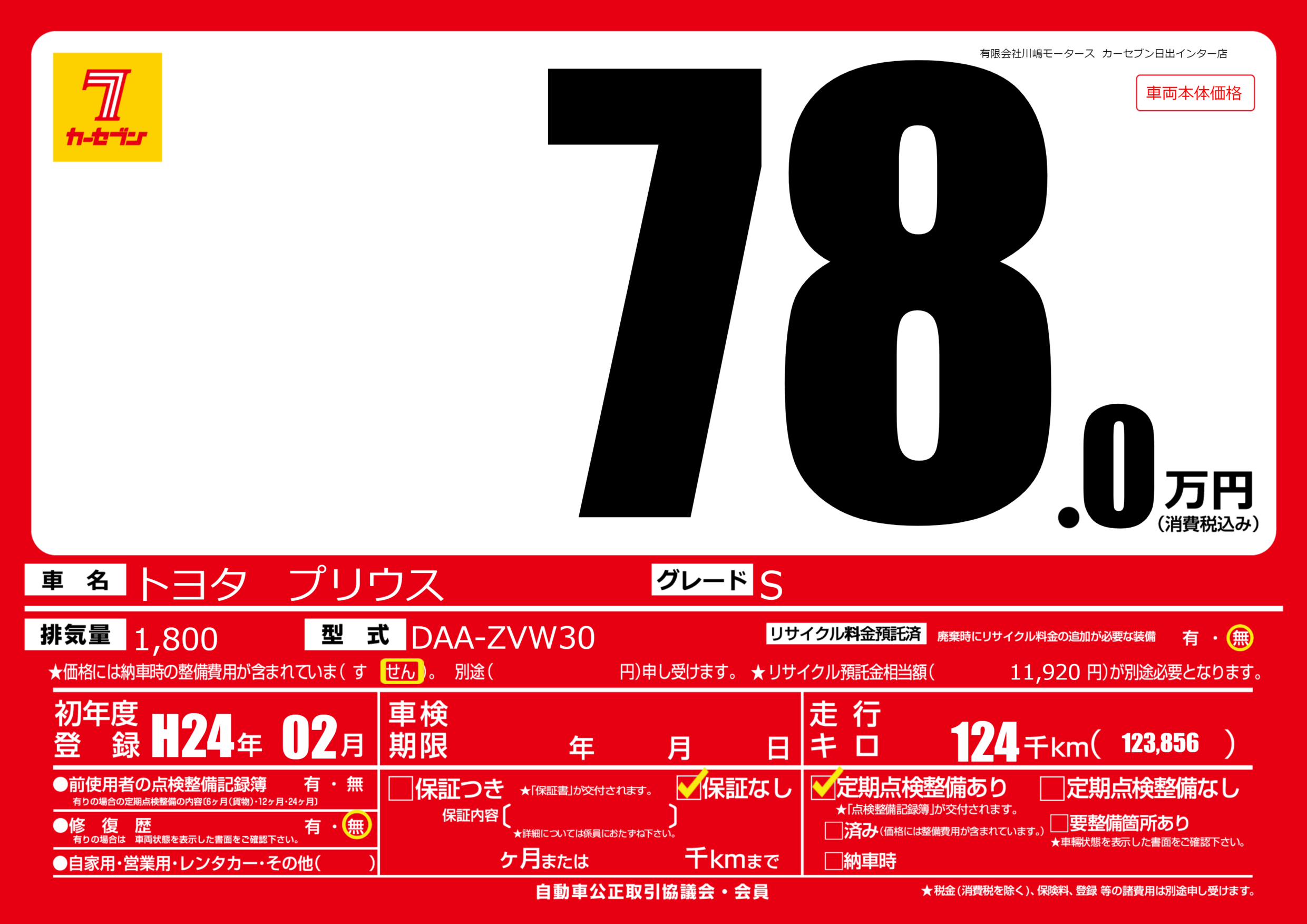 | 車名 | トヨタ プリウス | グレード ミッション 排気量 |