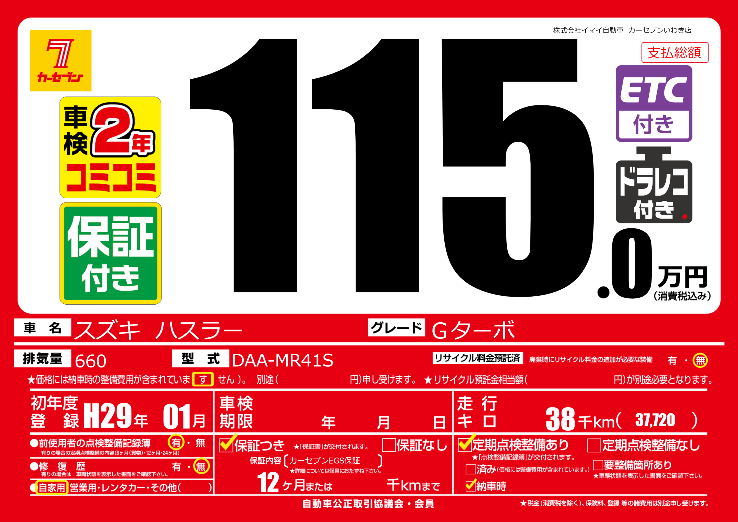 | 走行キロ | 3.8万km | 初年度登録 | H29年01月 |