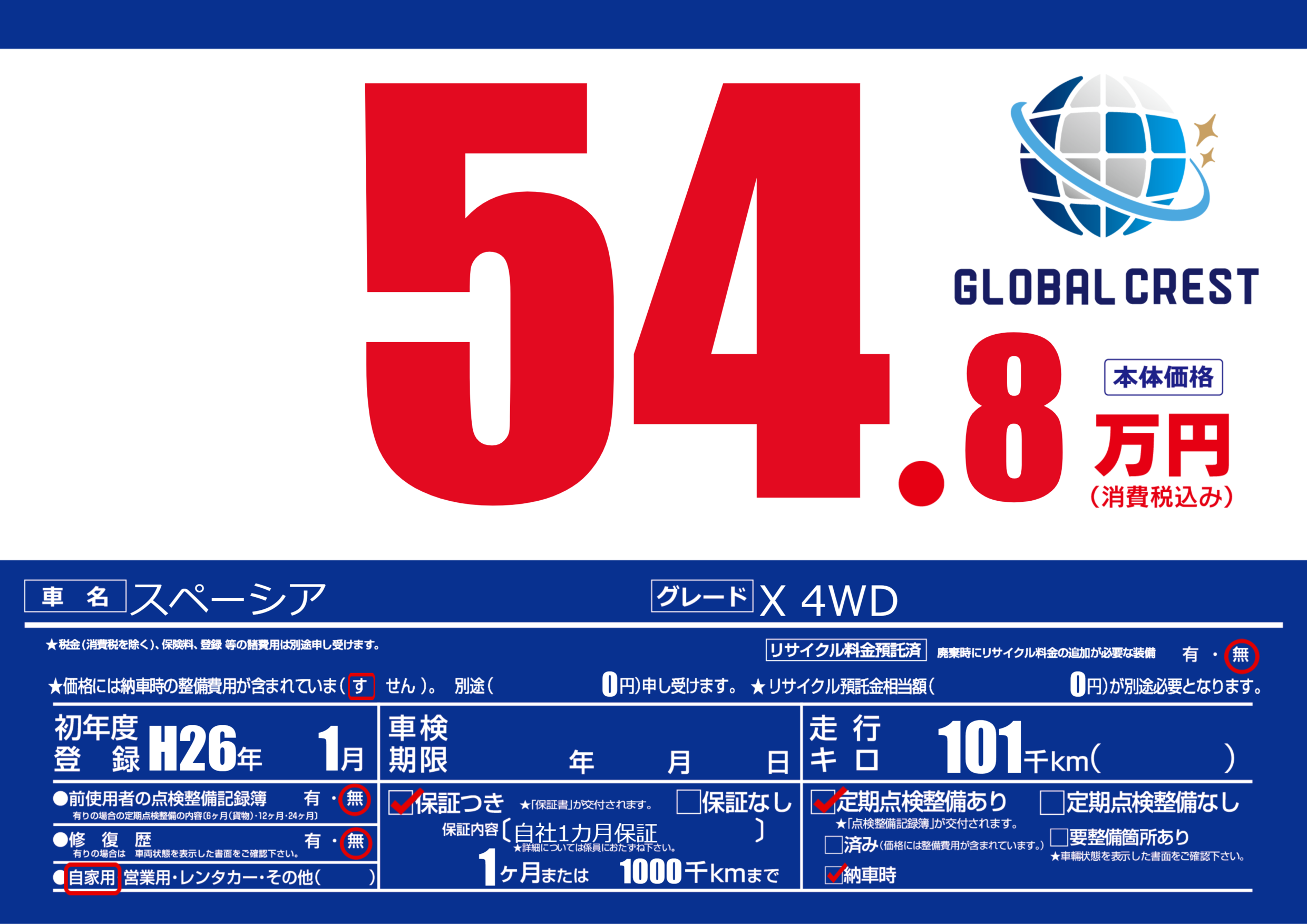 | 走行キロ | 10.1万km | 初年度登録 | H26年1月 |