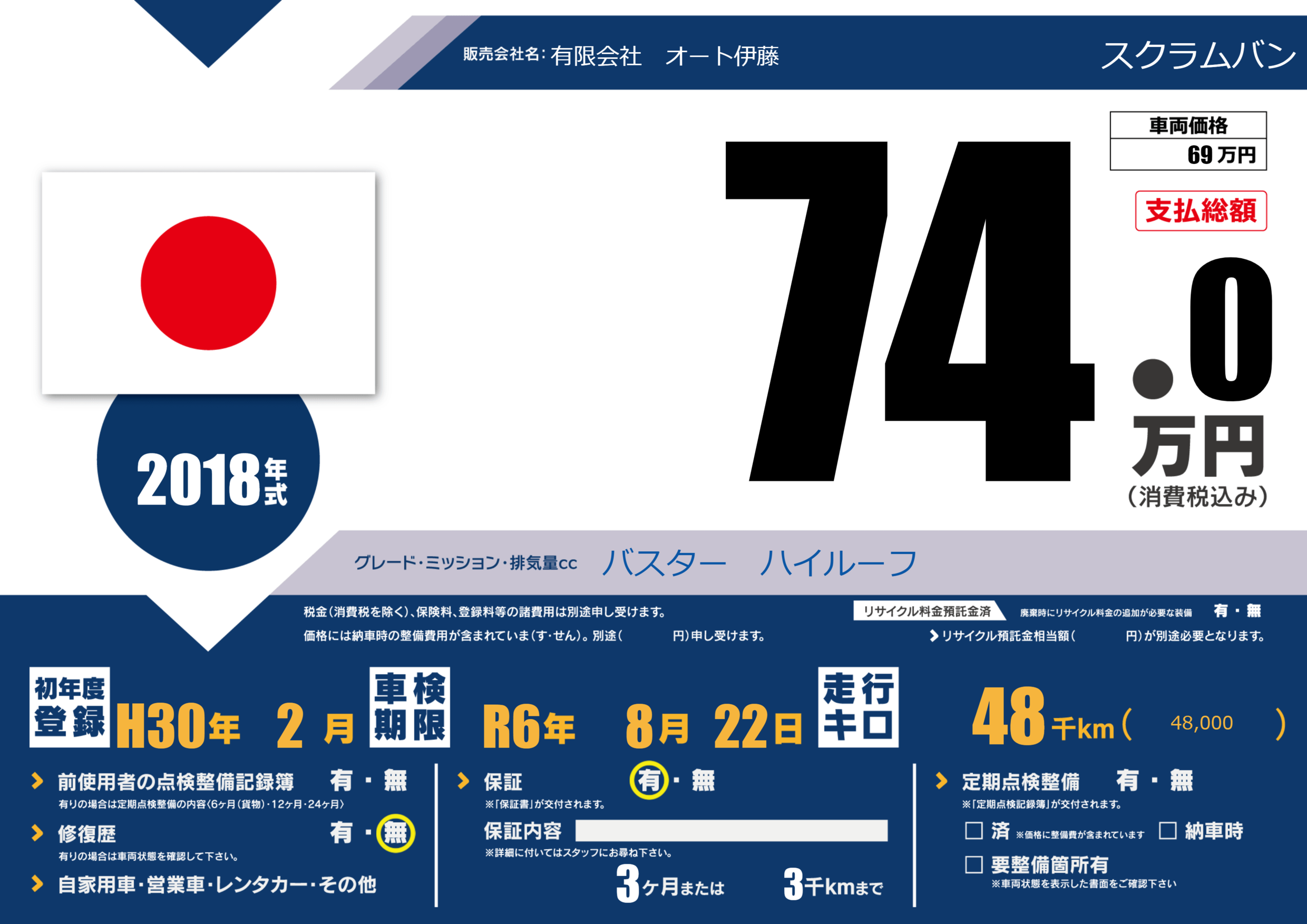 | 走行キロ | 4.8万km | 初年度登録 | H30年2月 |