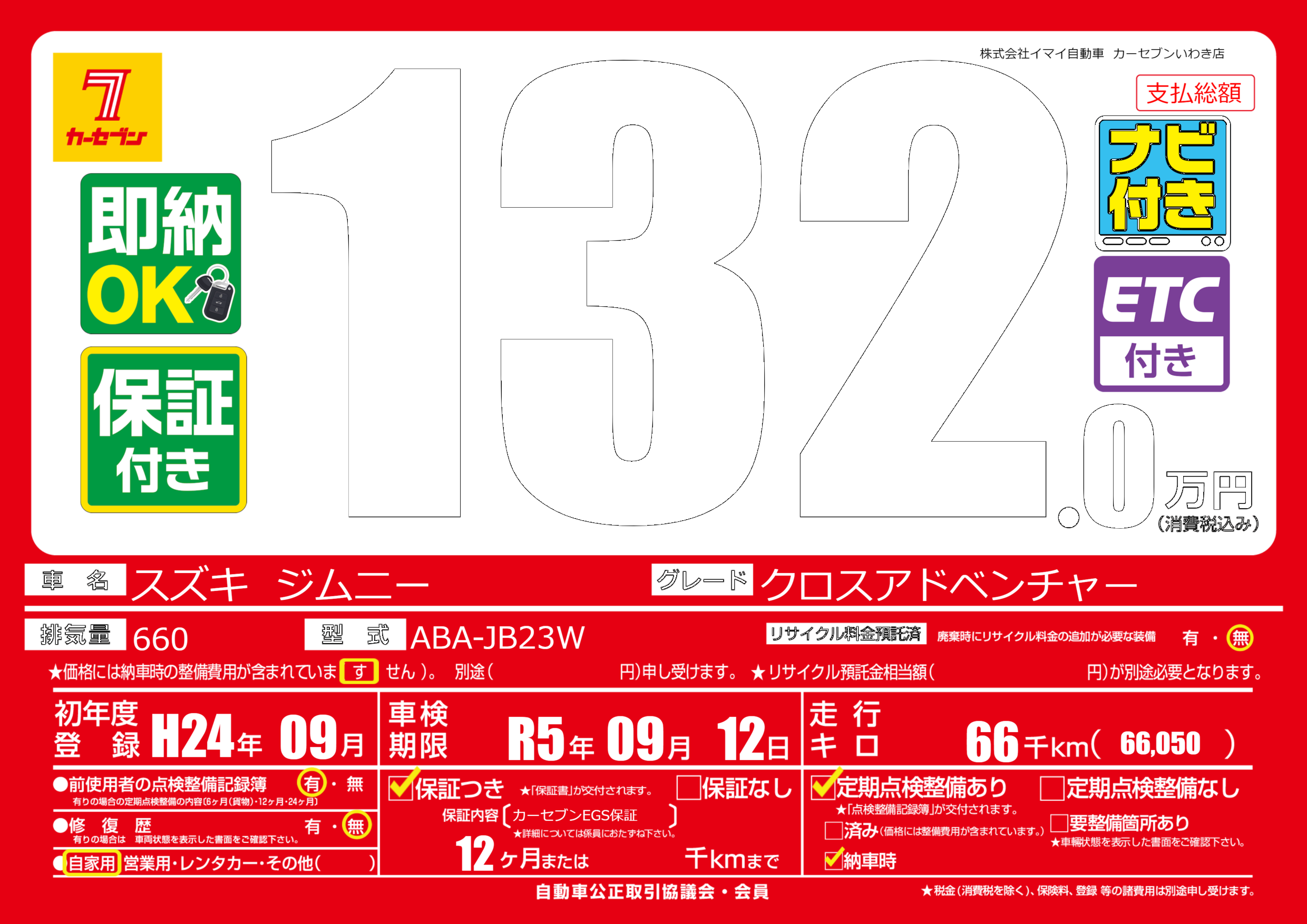 | 走行キロ | 6.6万km | 初年度登録 | H24年09月 |