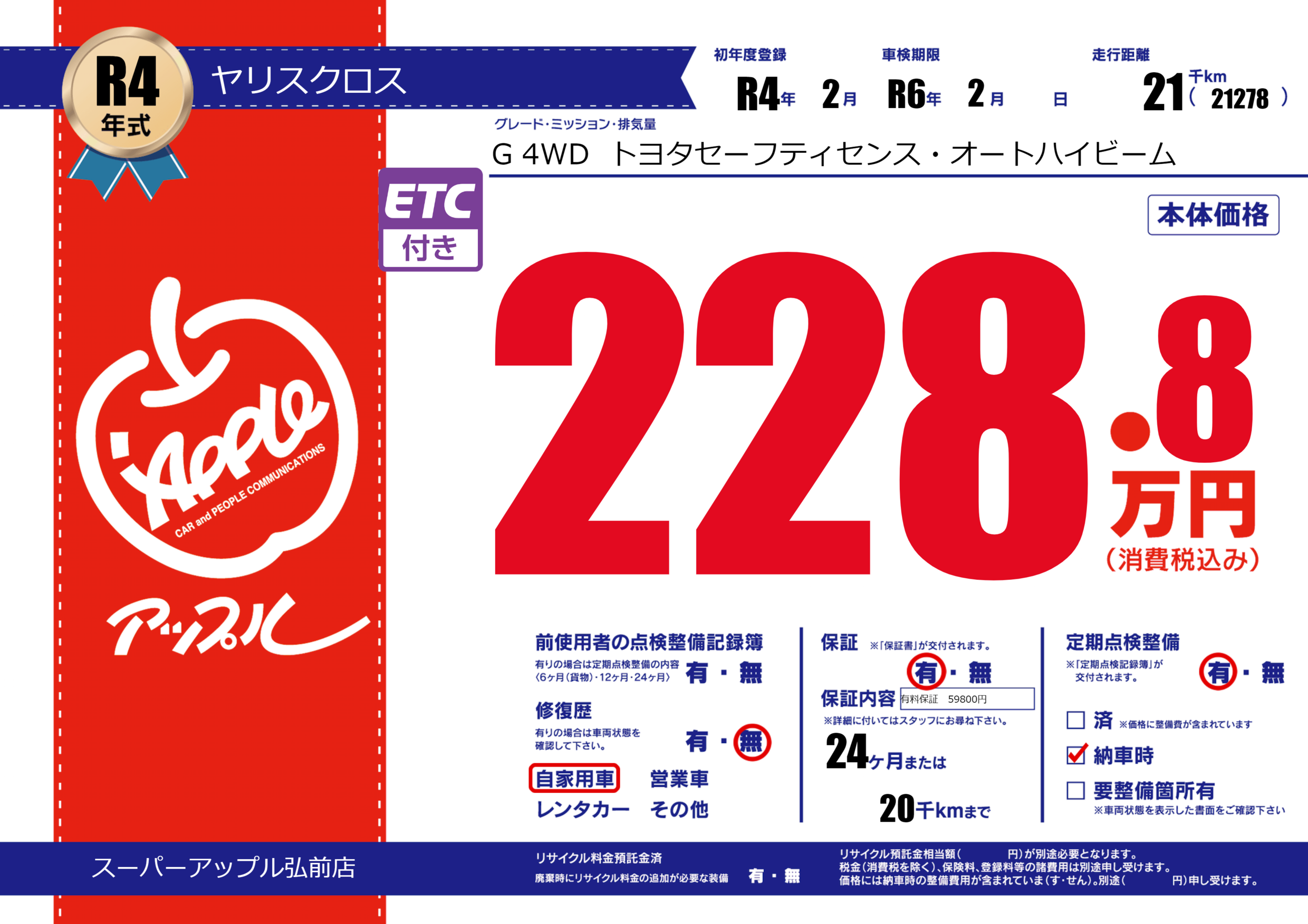 | 走行キロ | 2.1万km | 初年度登録 | R4年2月 |