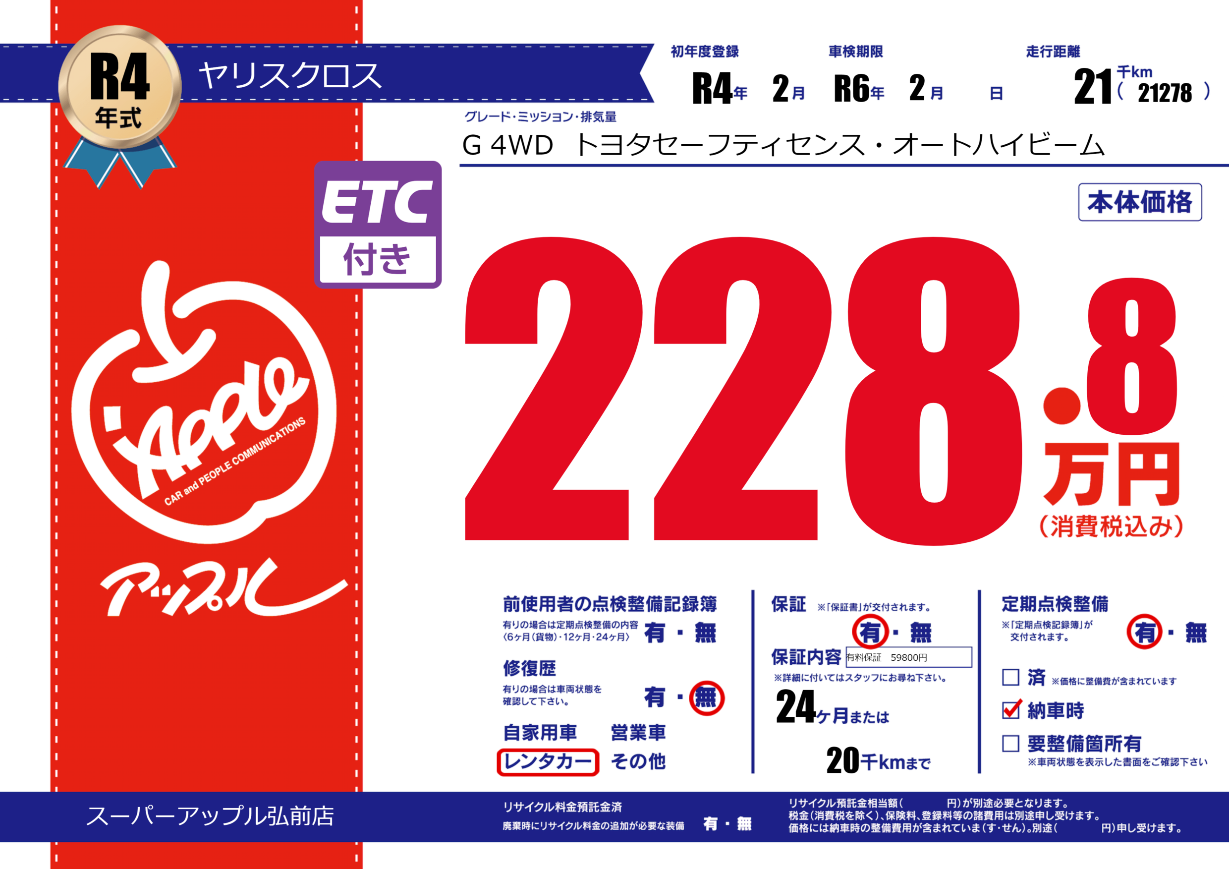 | 走行キロ | 2.1万km | 初年度登録 | R4年2月 |